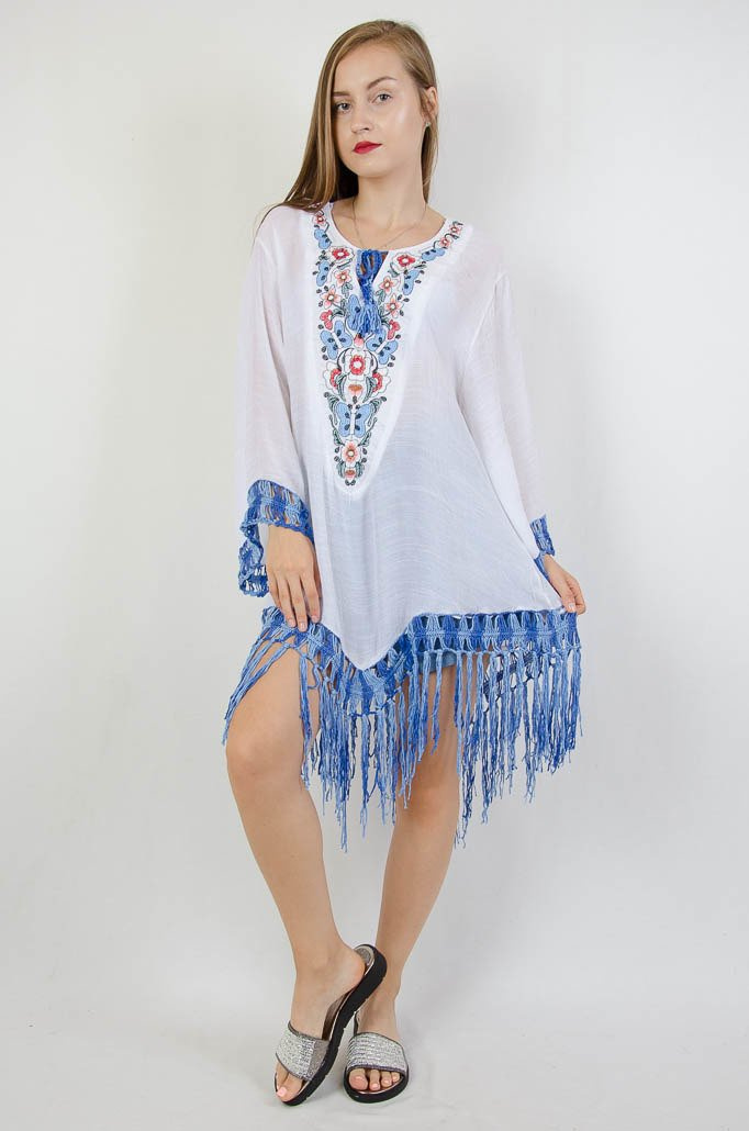 BIAŁA TUNIKA W STYLU BOHO Z NIEBIESKIMI ELEMENTAMI