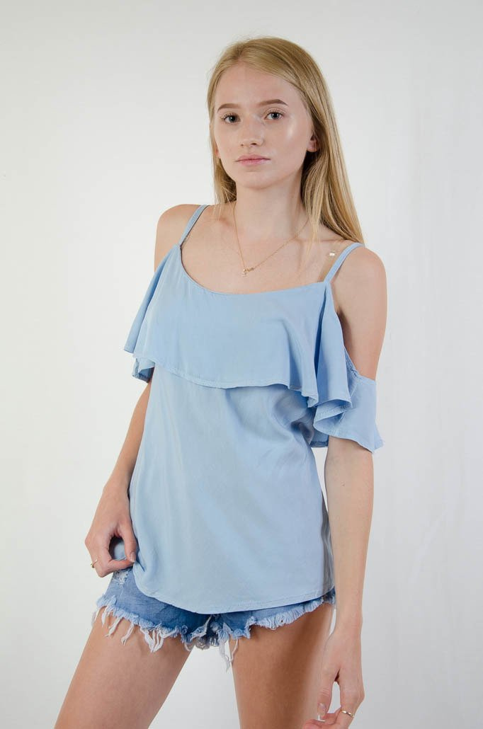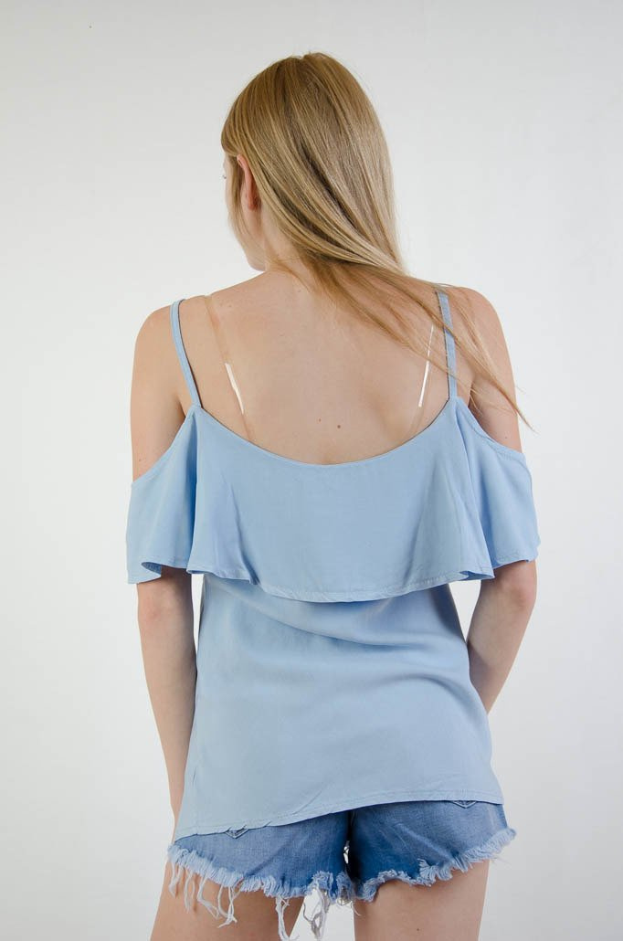 Niebieska bluzka hiszpanka na cienkich ramiączkach