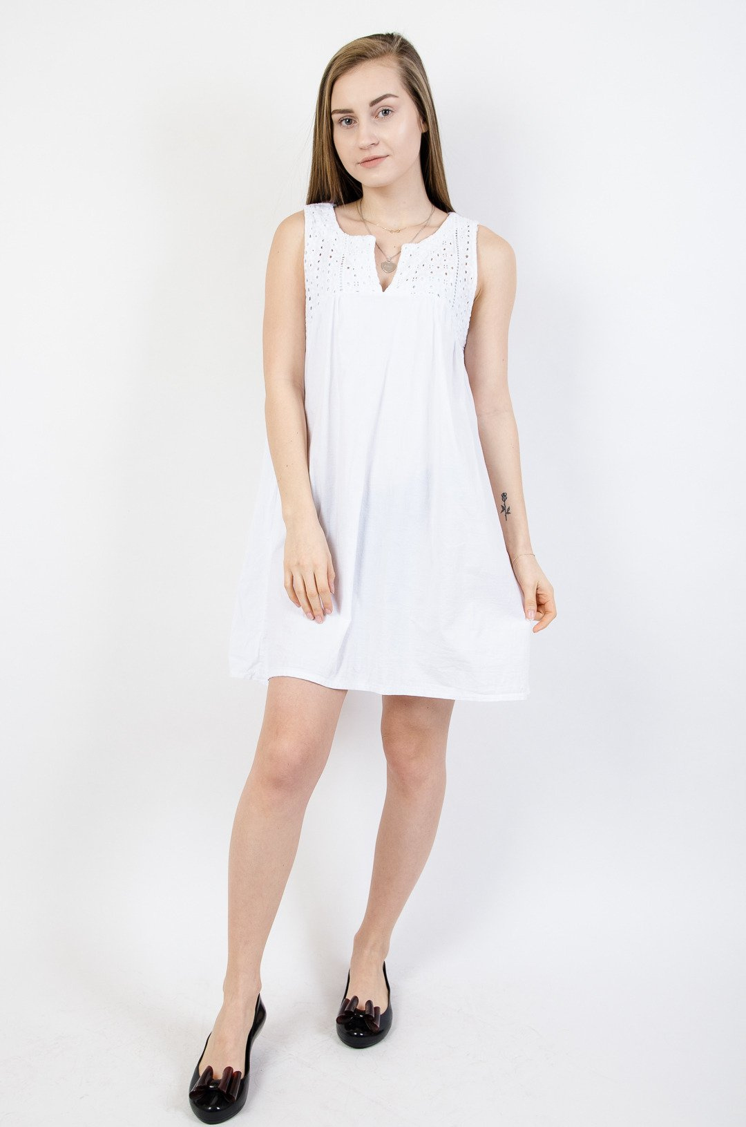 Biała trapezowa sukienka z ażurowymi wstawkami