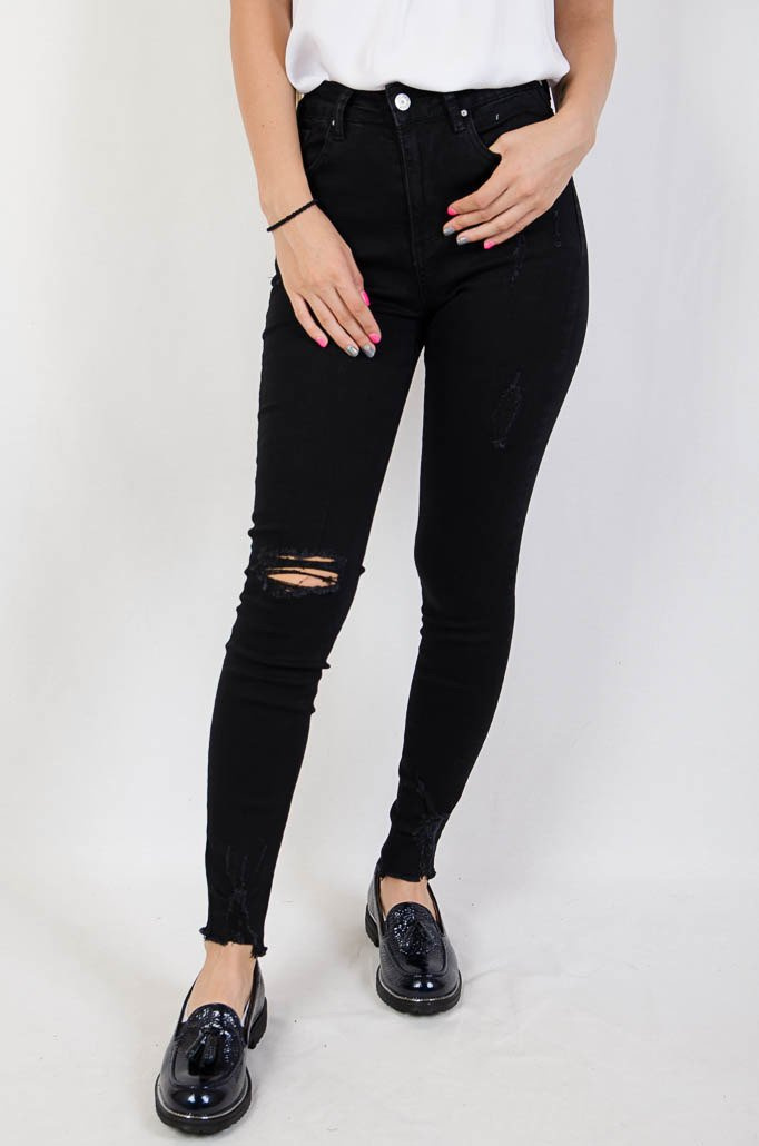 Czarne jeansowe spodnie z przetarciami oraz szarpaniem na dole nogawki