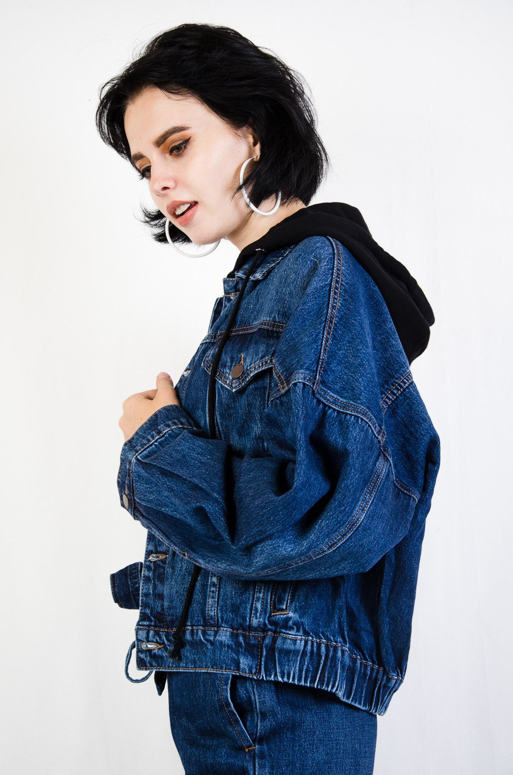 Ciemna kurtka jeansowa z kapturem oraz ściągaczem na dole.