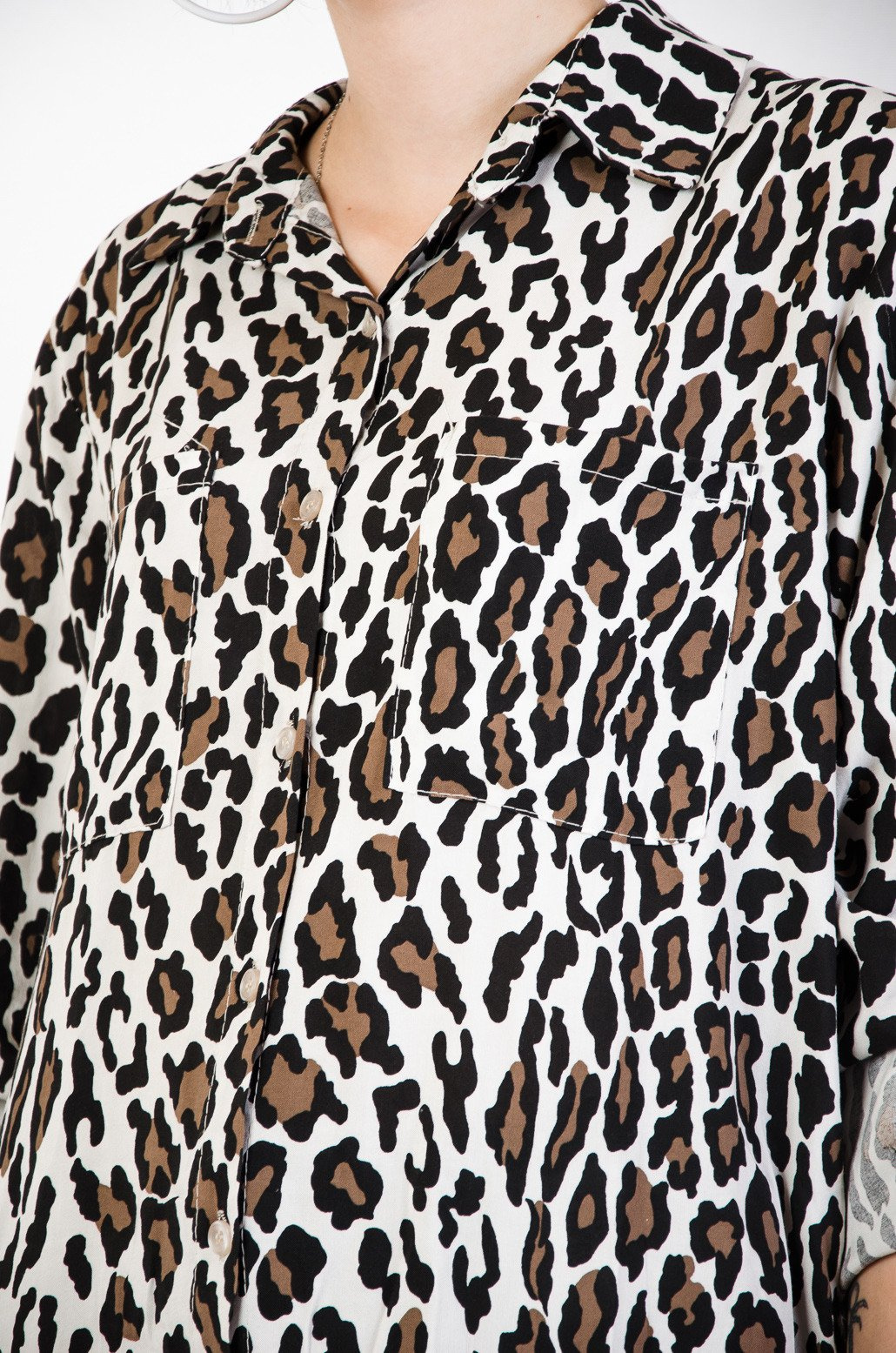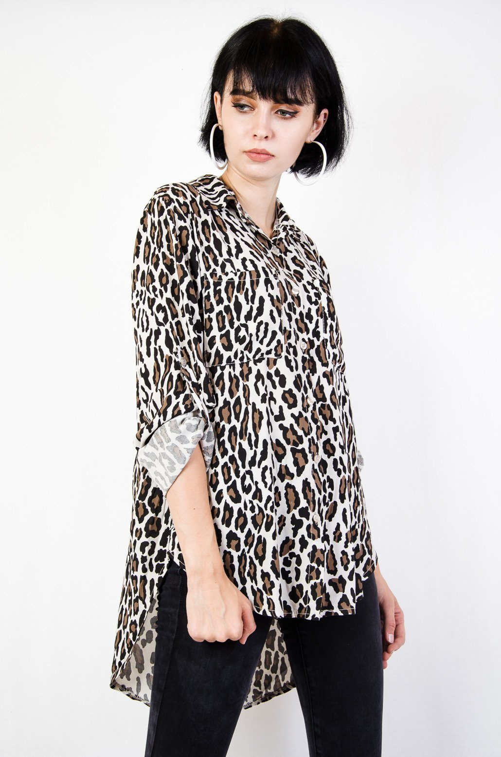 Asymetryczna koszula w panterkę z podwijanymi rękawami.