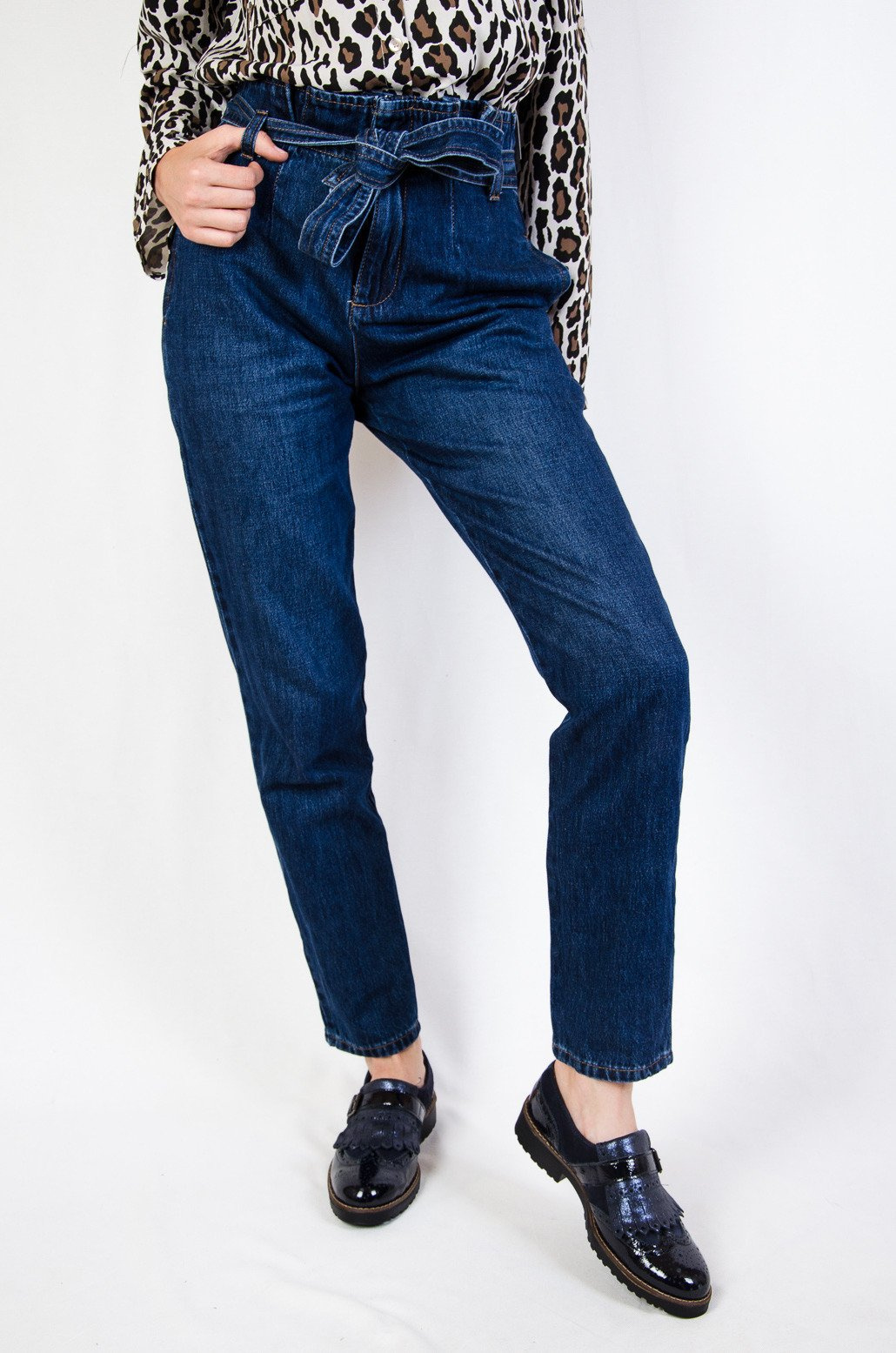 Ciemne jeansowe pumpy z wiązaniem w pasie