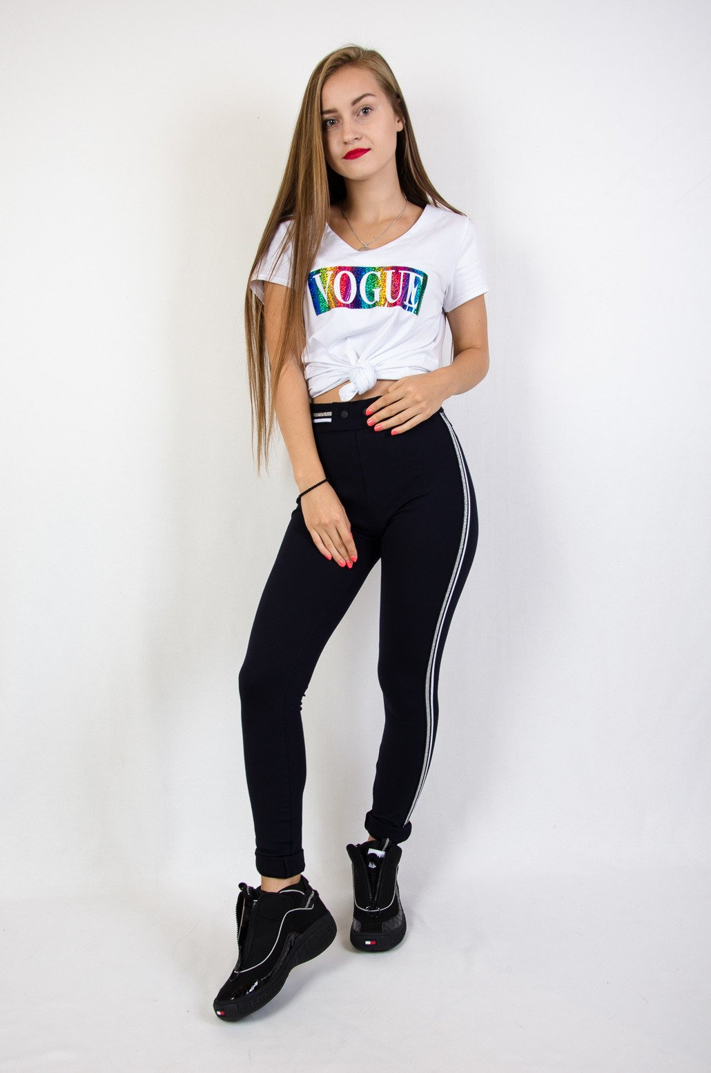 Granatowe spodnie z lampasami oraz gumką w pasie