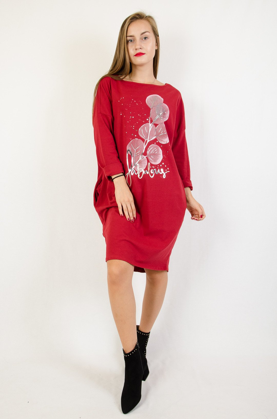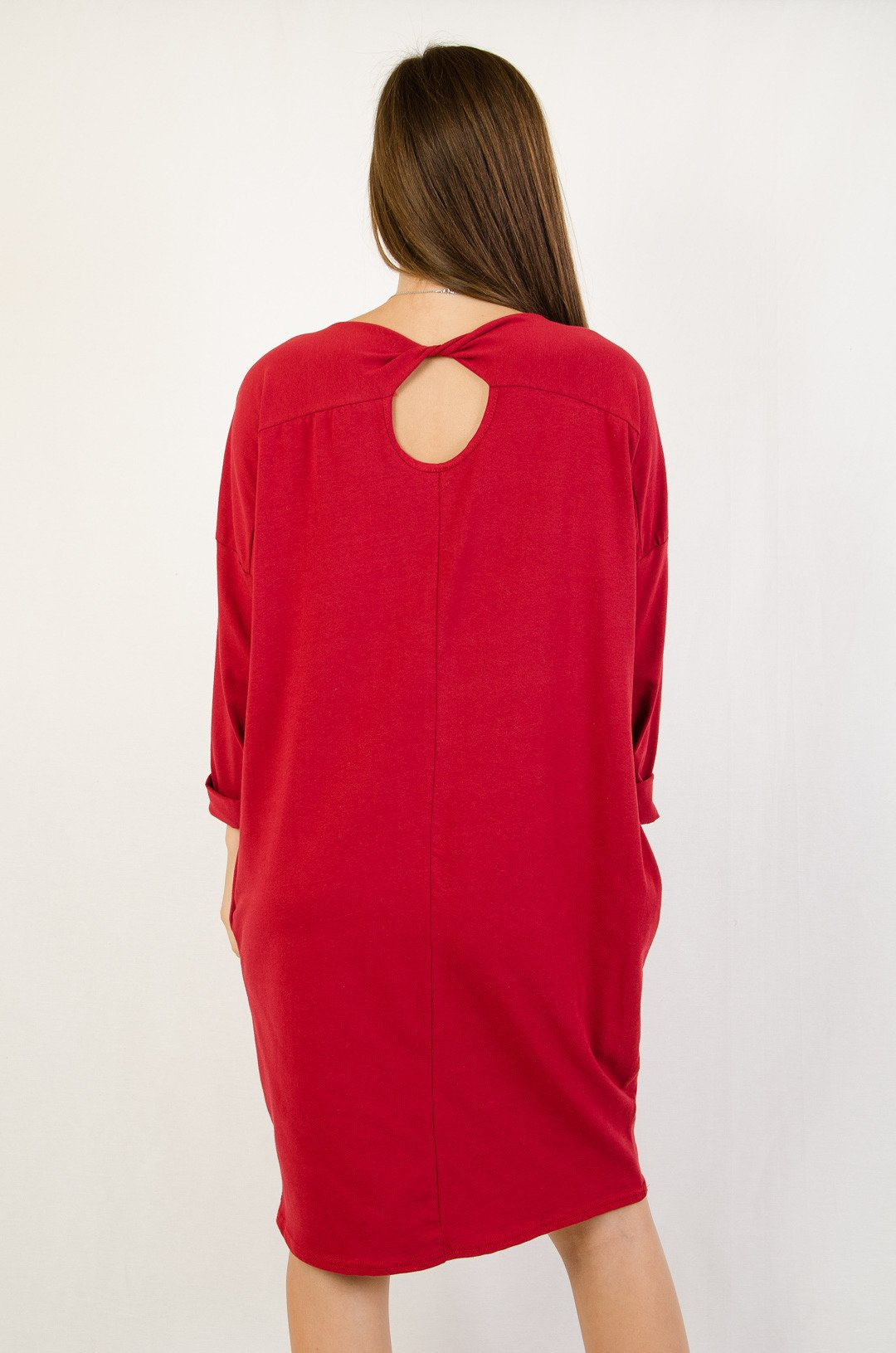 Czerwona sukienka z kieszeniami oraz kwiatem z przodu