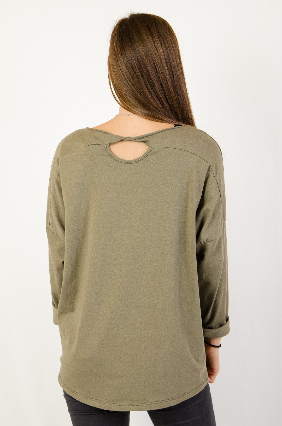 Zielona  asymetryczna bluzka typu oversize z aplikacja z przodu.