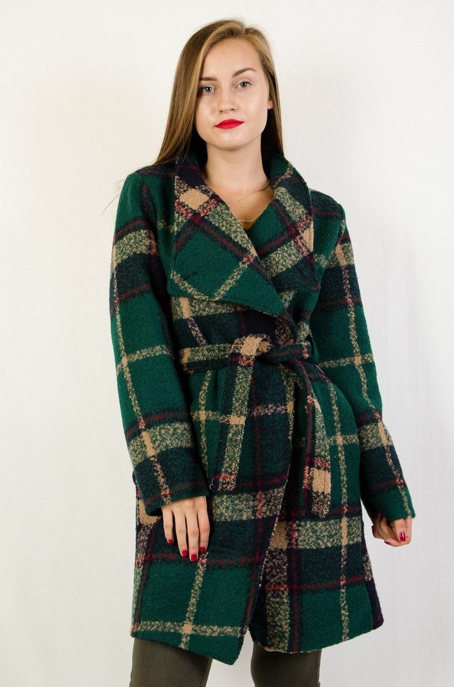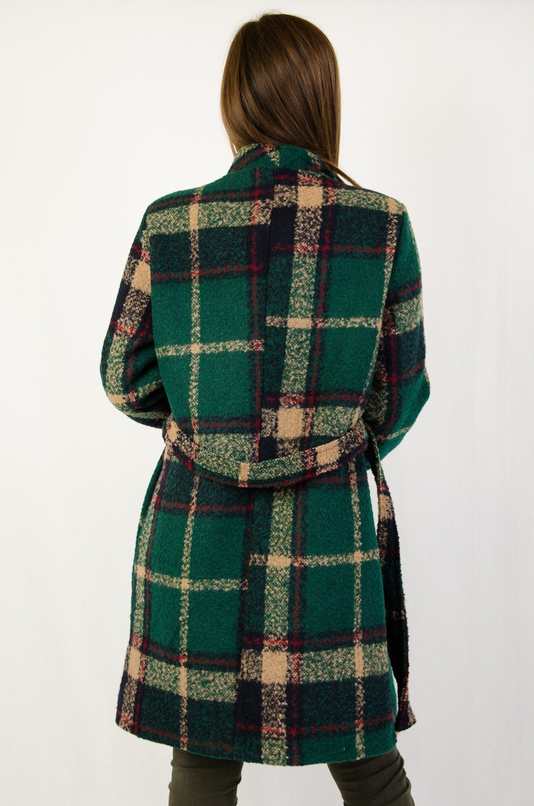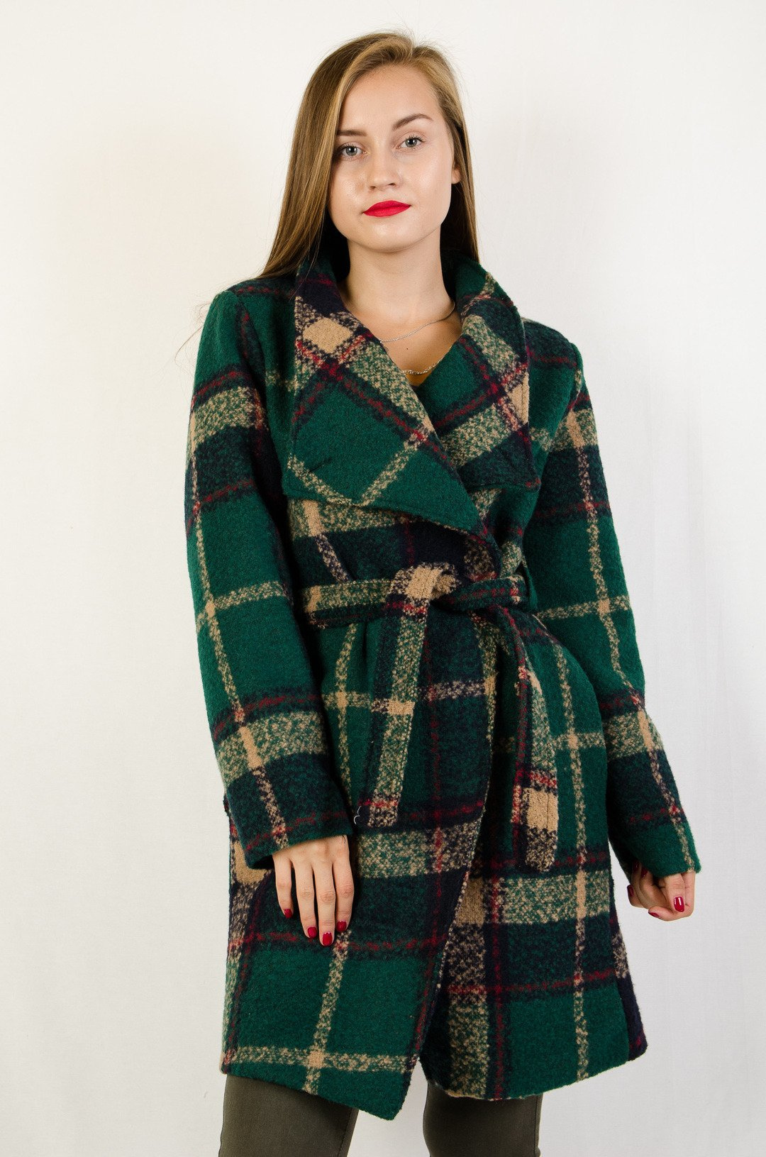 Zielony płaszcz w kratę, z wiązaniem w pasie oraz guzikiem przy szyi