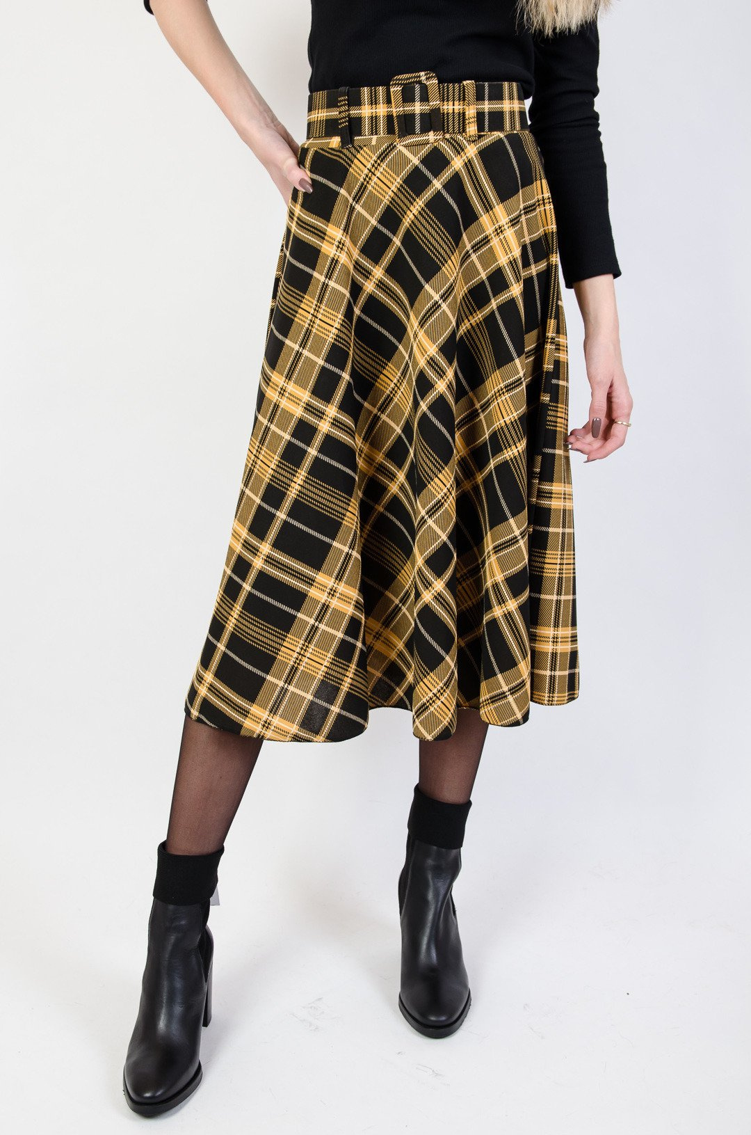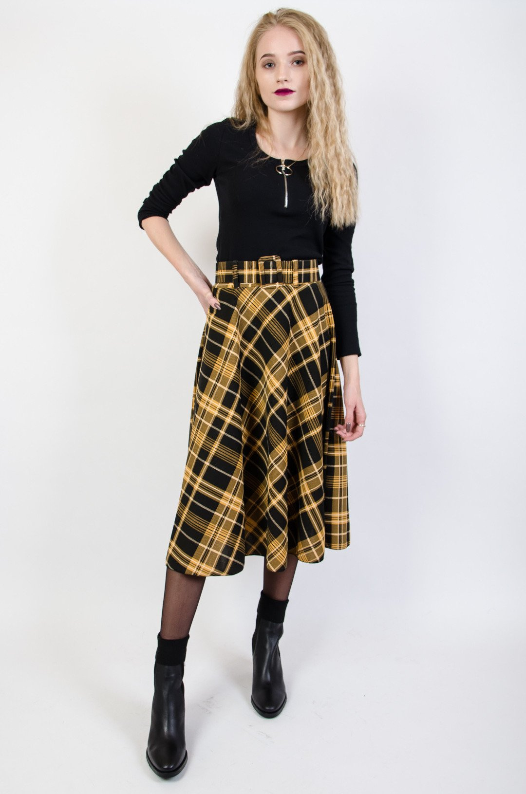 Żółta rozkloszowana spódnica w kratę z paskiem