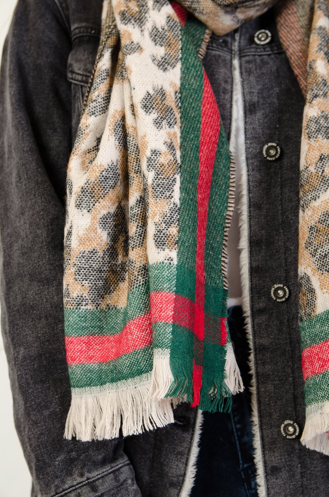 Beżowy szal w cętki z czerwono zielonym pasem