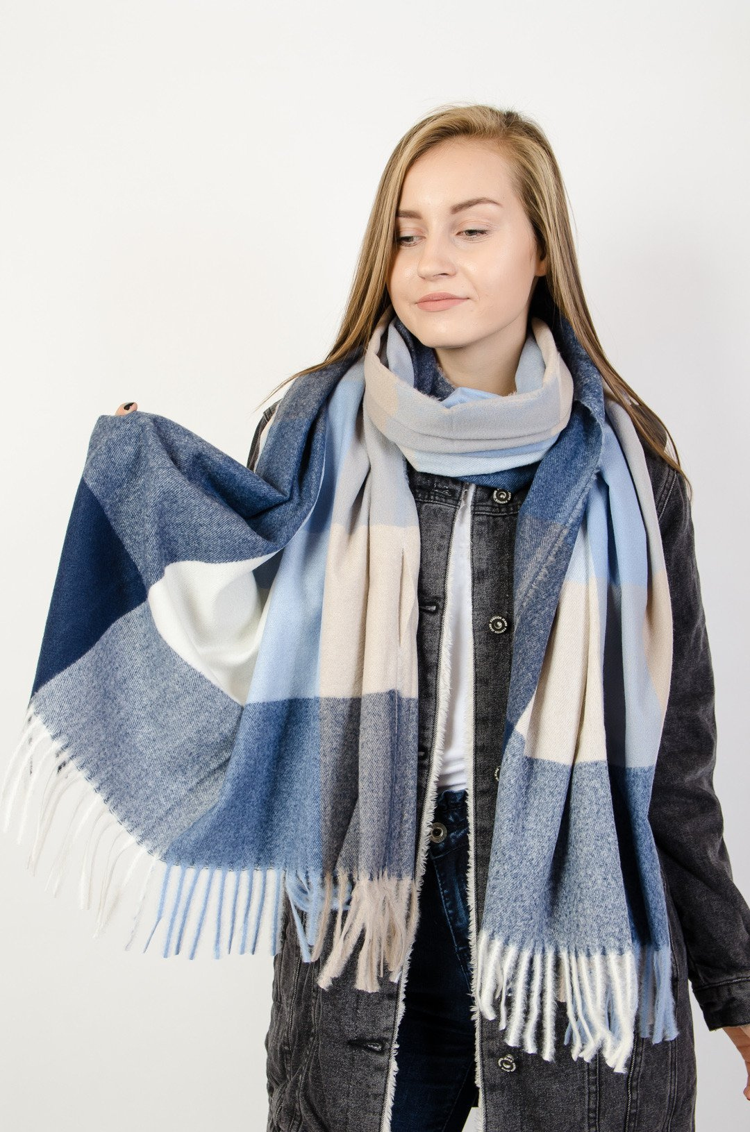 Beżowo- niebieski szal w kratę