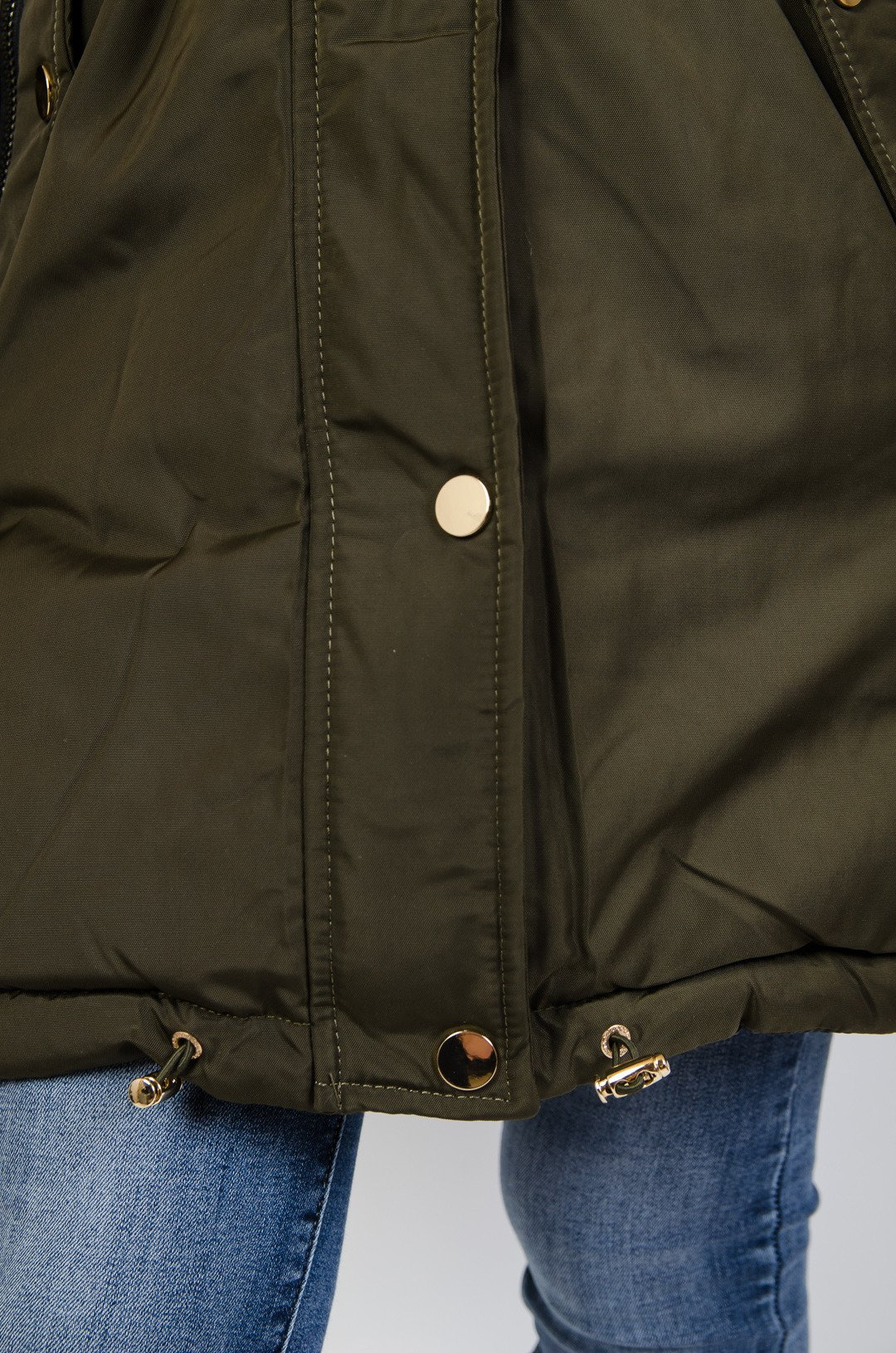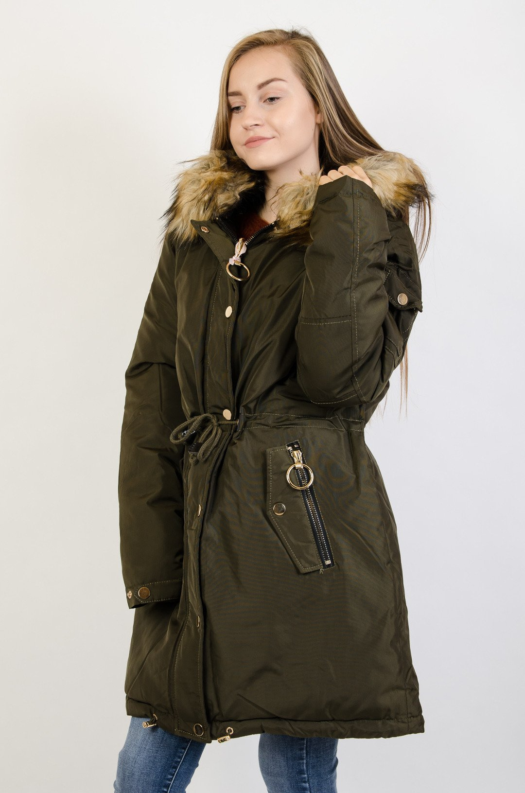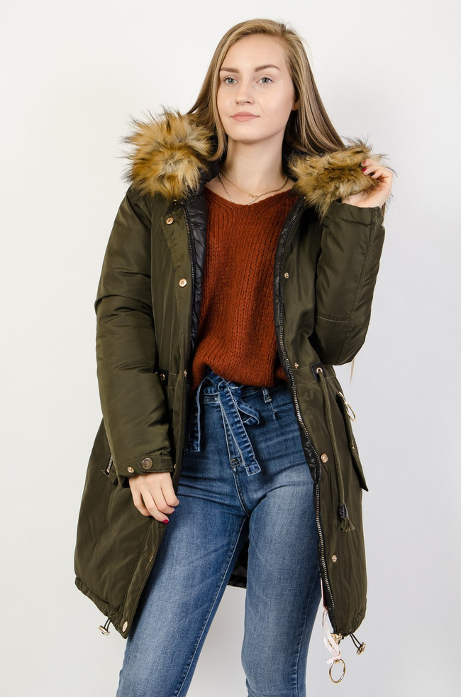 Zielono-czarna dwustronna kurtka. Możliwe jest odpięcie futerka przy kapturze.