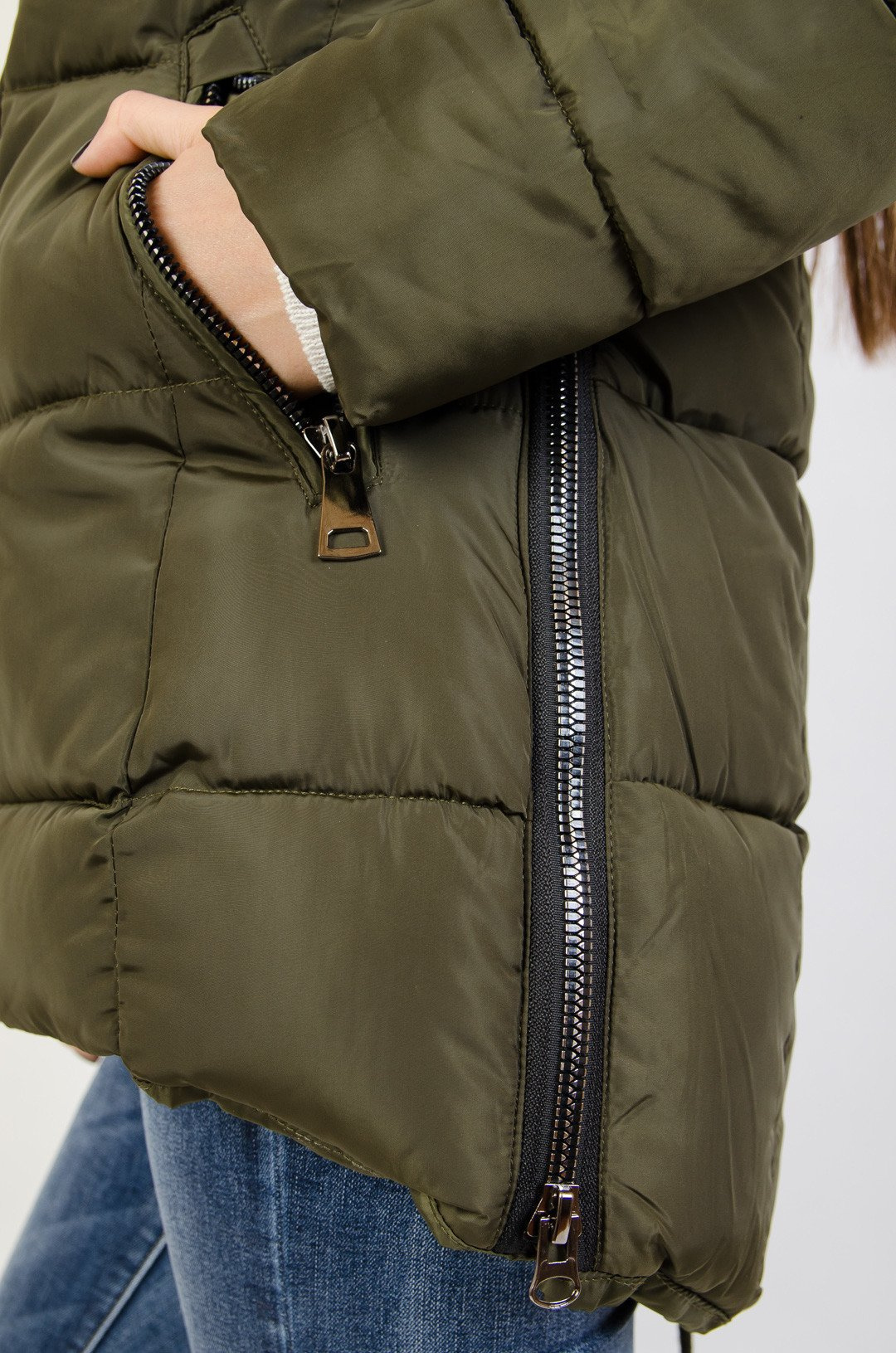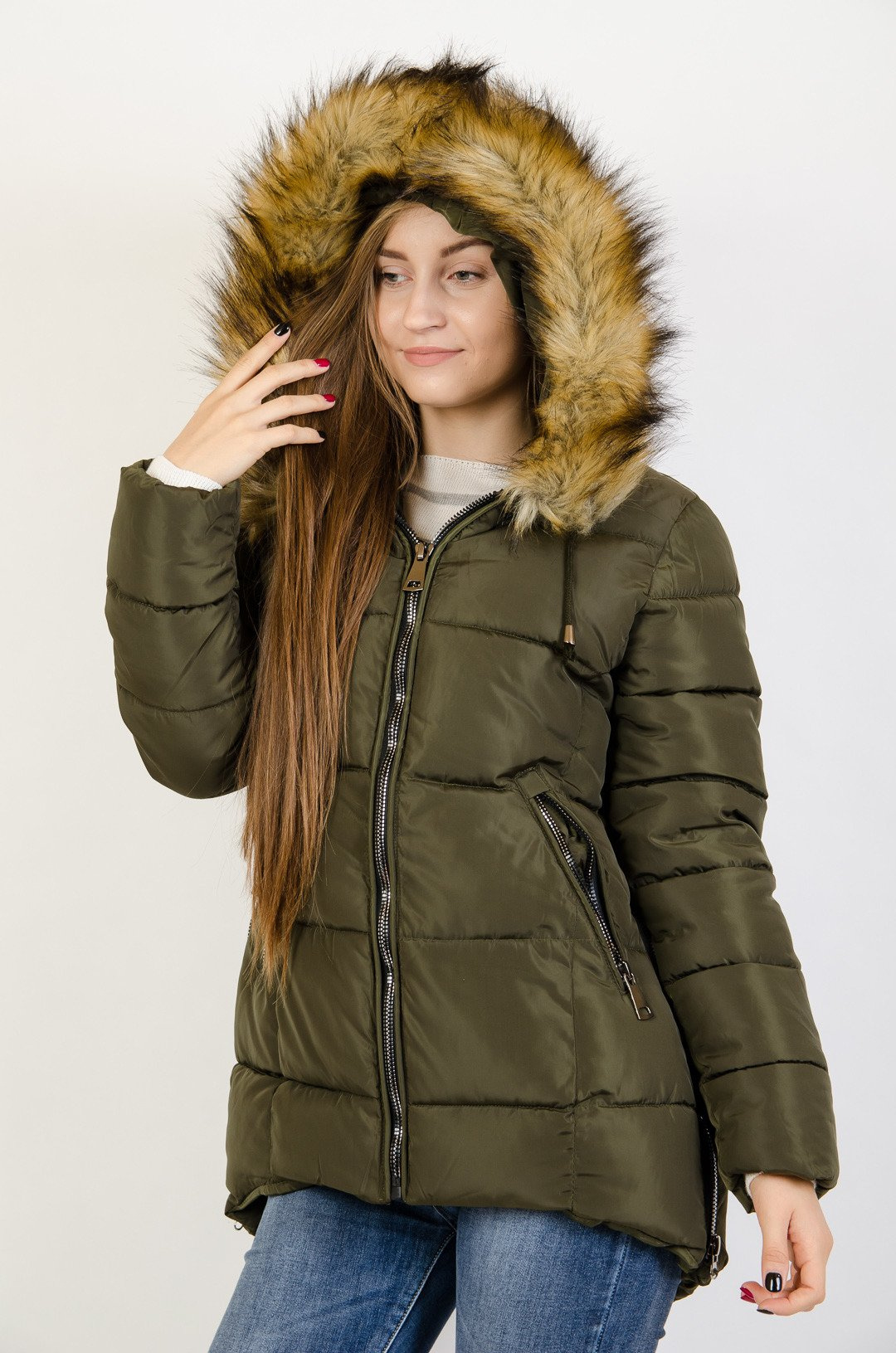 Zielona ocieplana kurtka z zamkami po bokach. Możliwe jest odpięcie futerka przy kapturze.