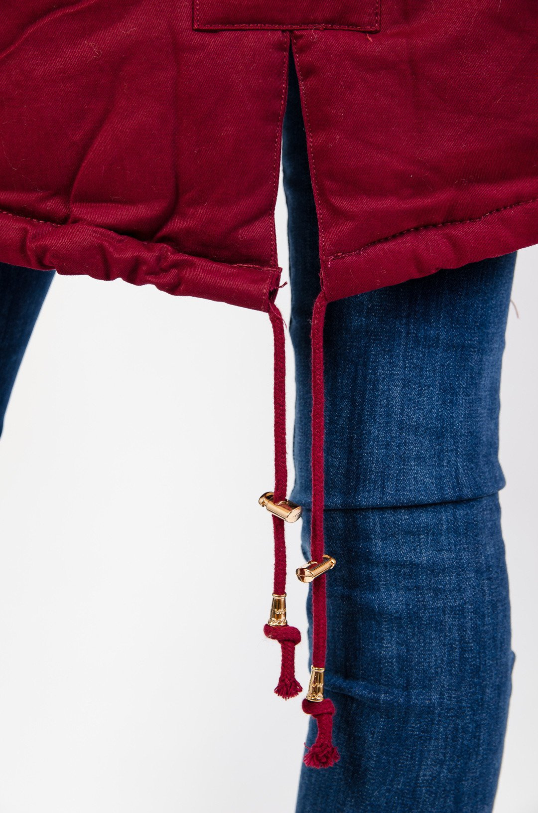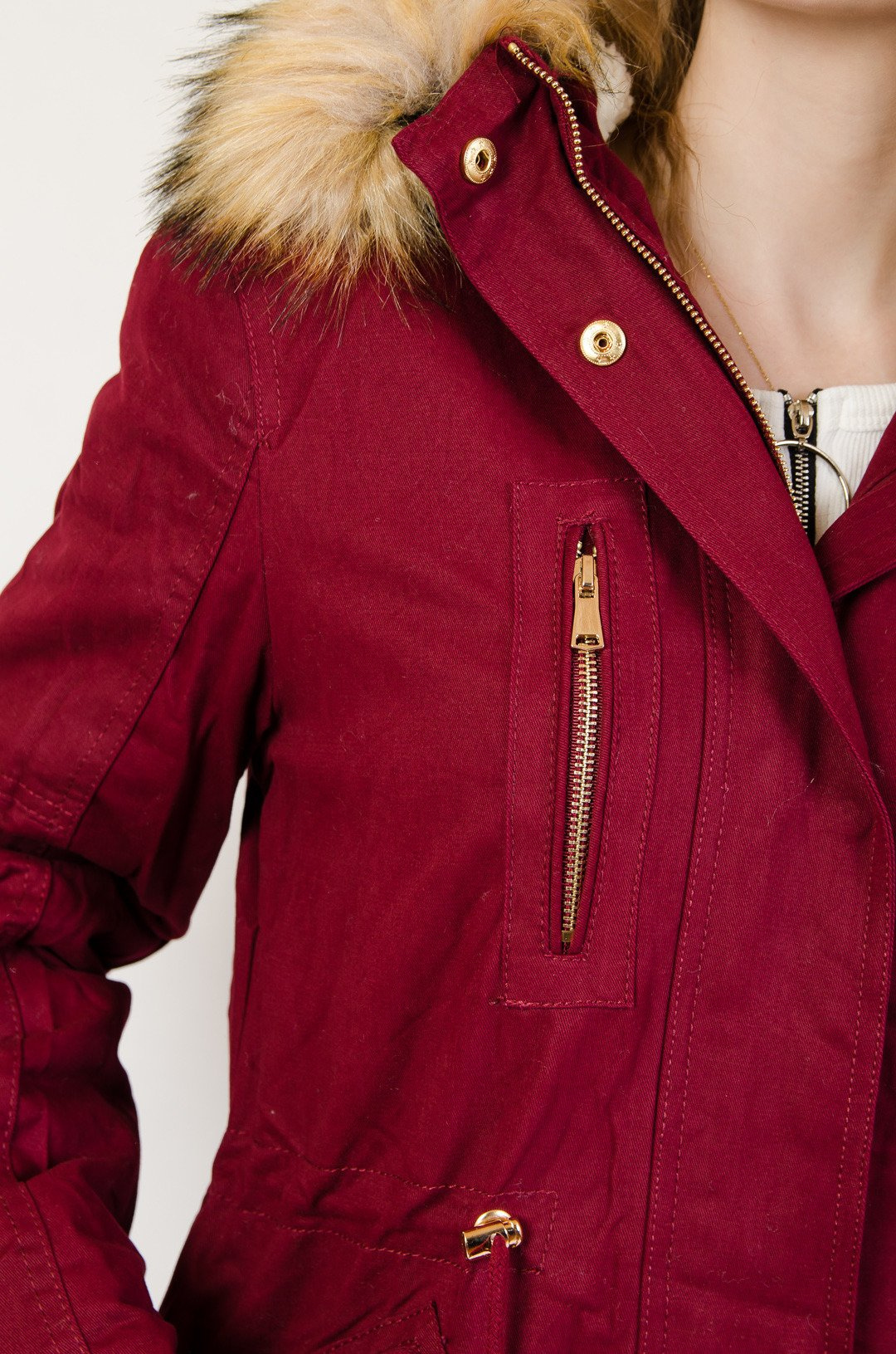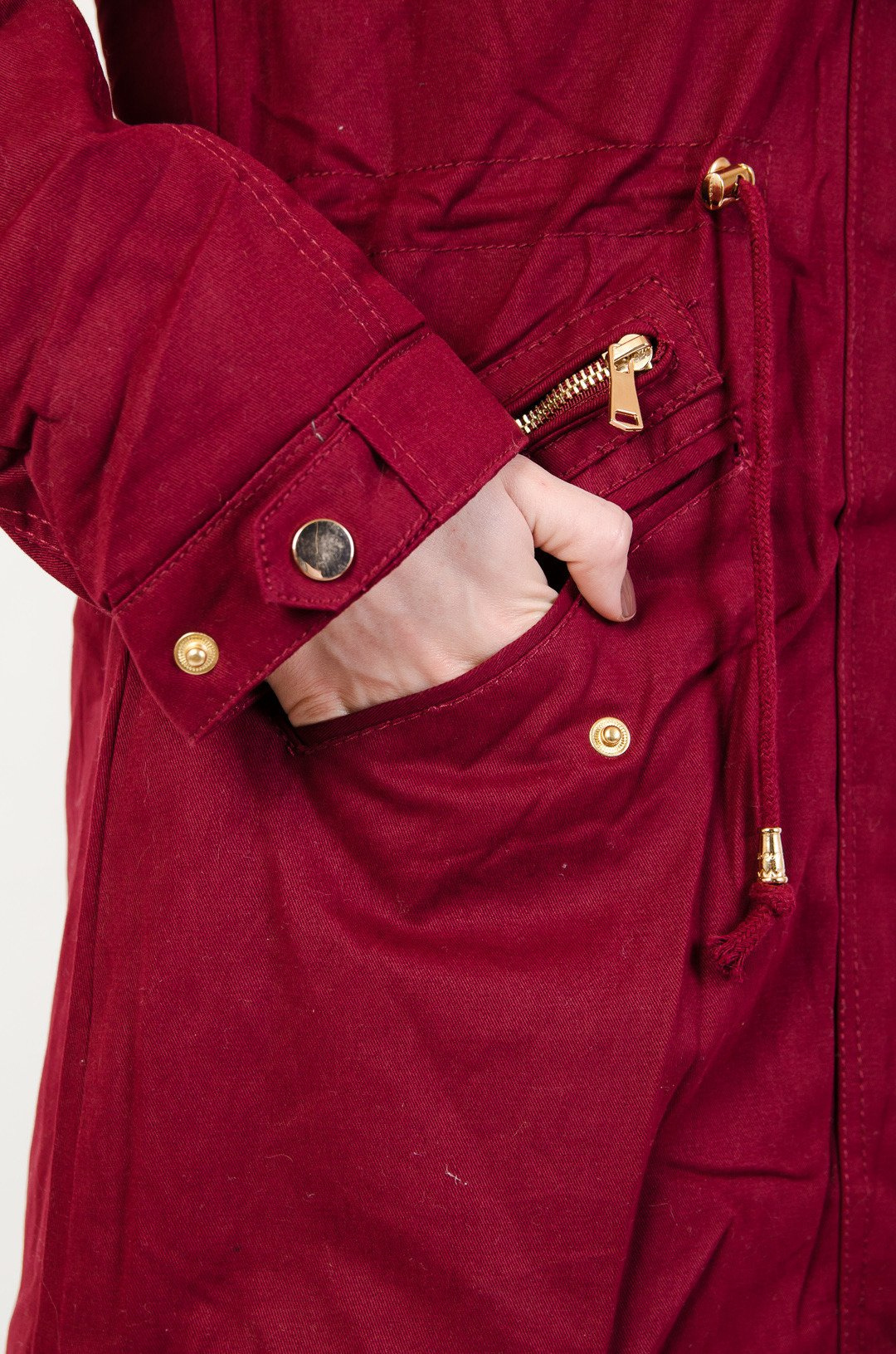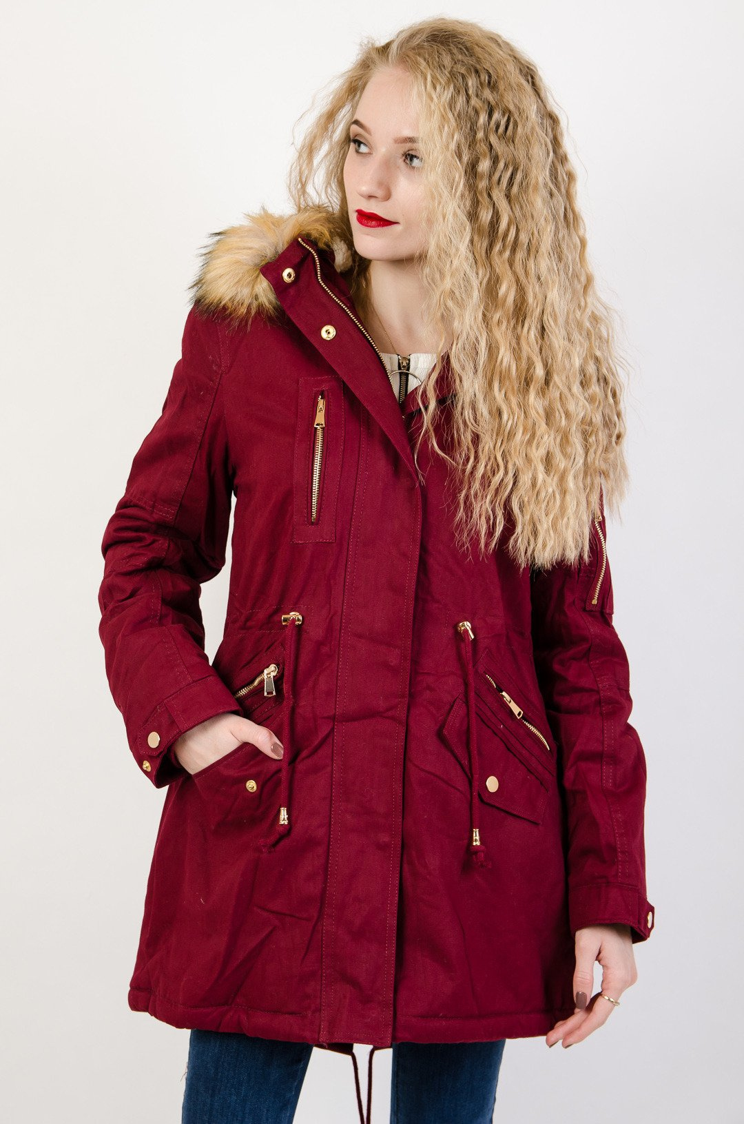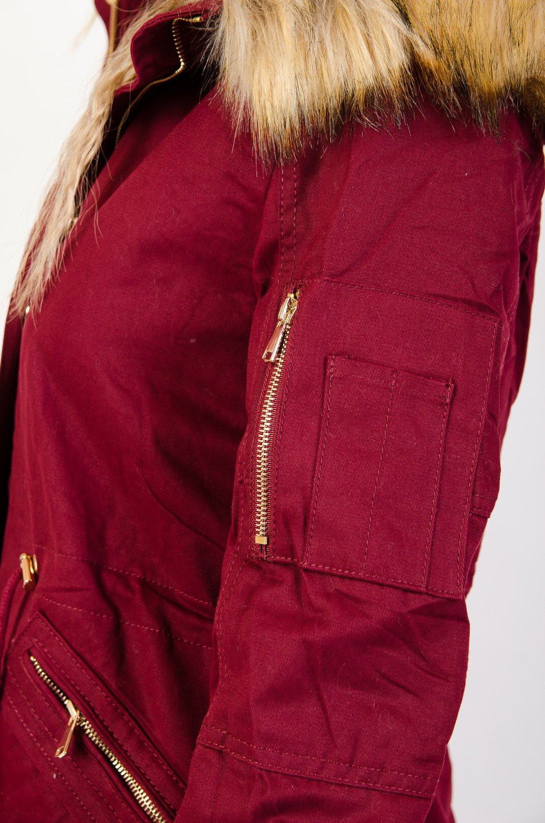 Bordowa asymetryczna kurtka ze złotymi zamkami