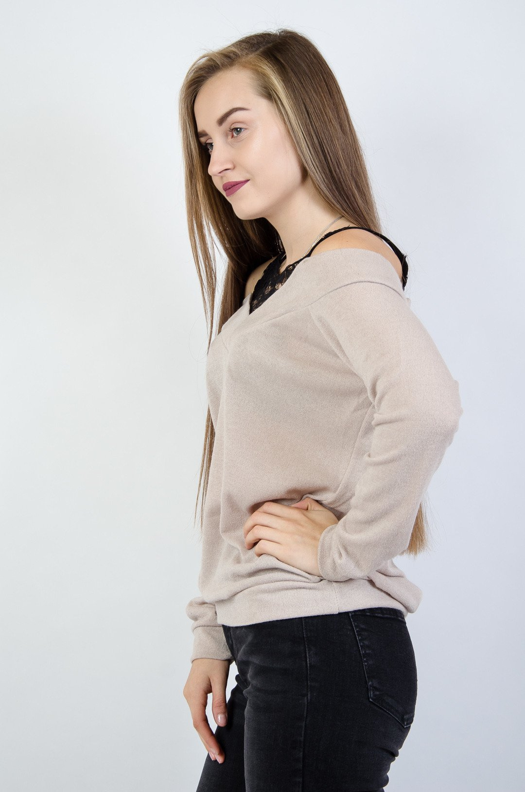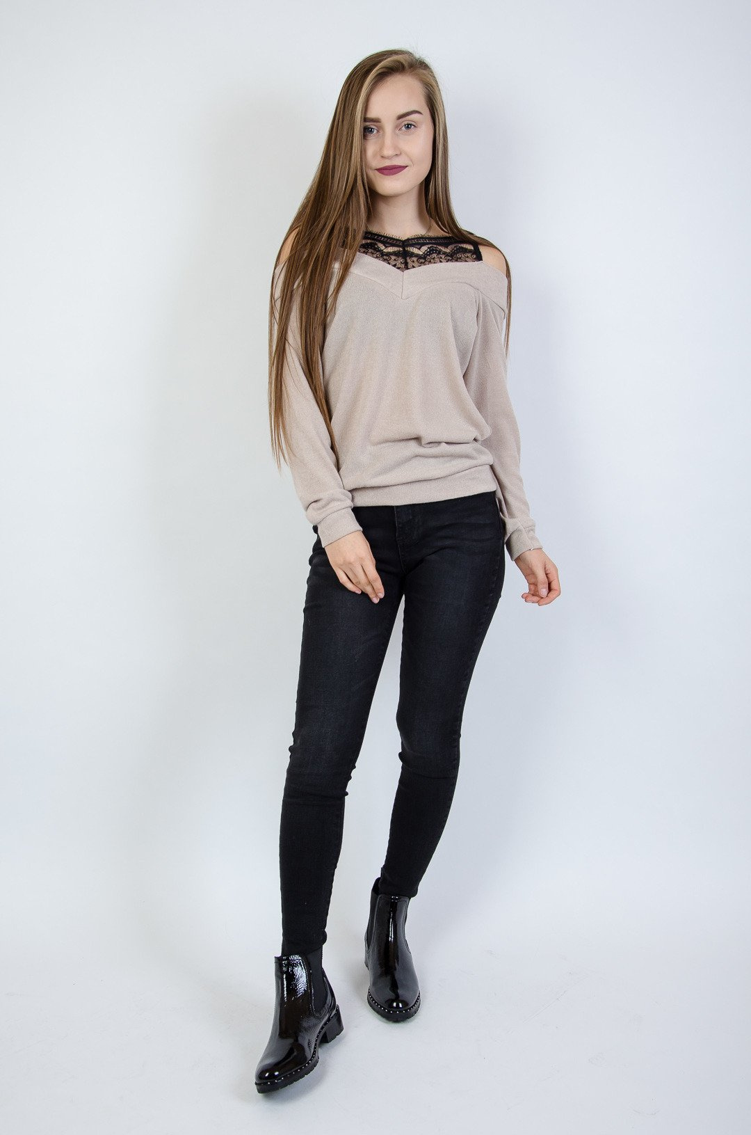 Beżowa dzianinowa bluzka z wstawkami z koronki
