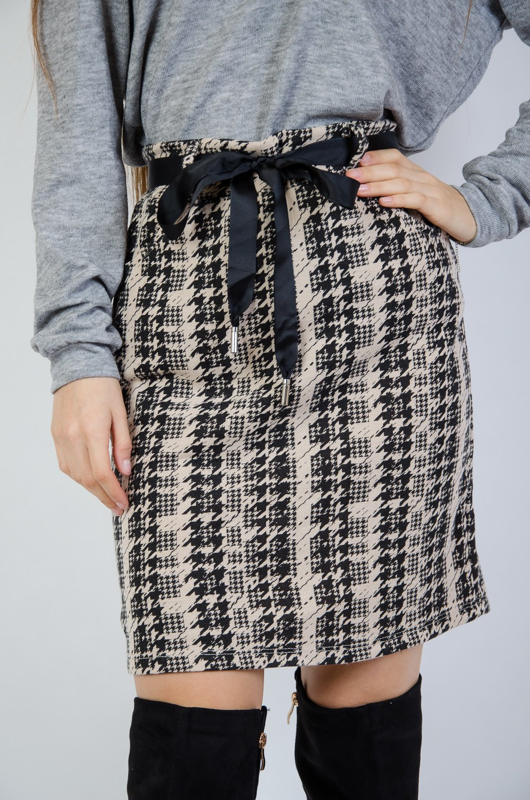 Beżowa spódnica w pepitkę wiązana wstążka w pasie