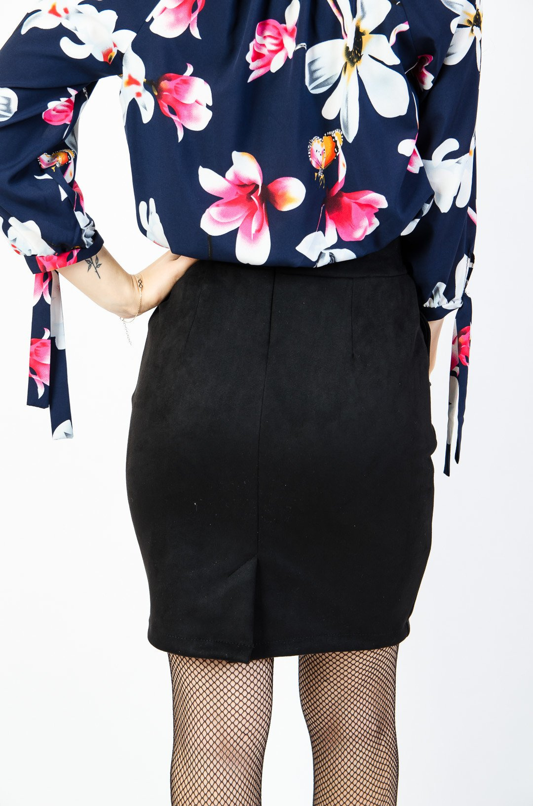 Czarna zamszowa ołówkowa spódnica z paskiem oraz zamkiem z tyłu.