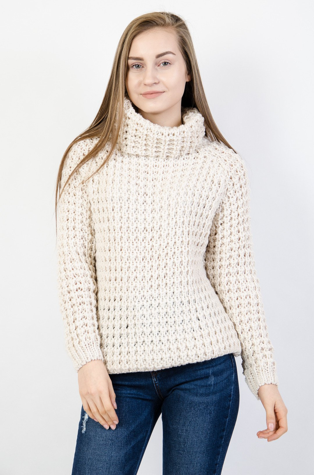 Beżowy sweter z golfem przeplatany srebrną nicią