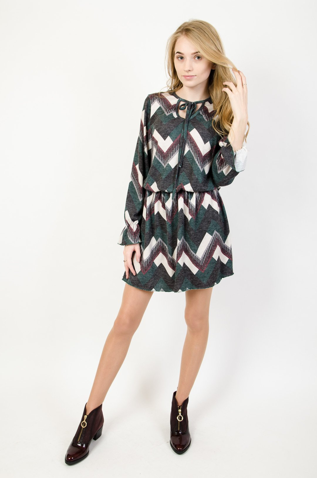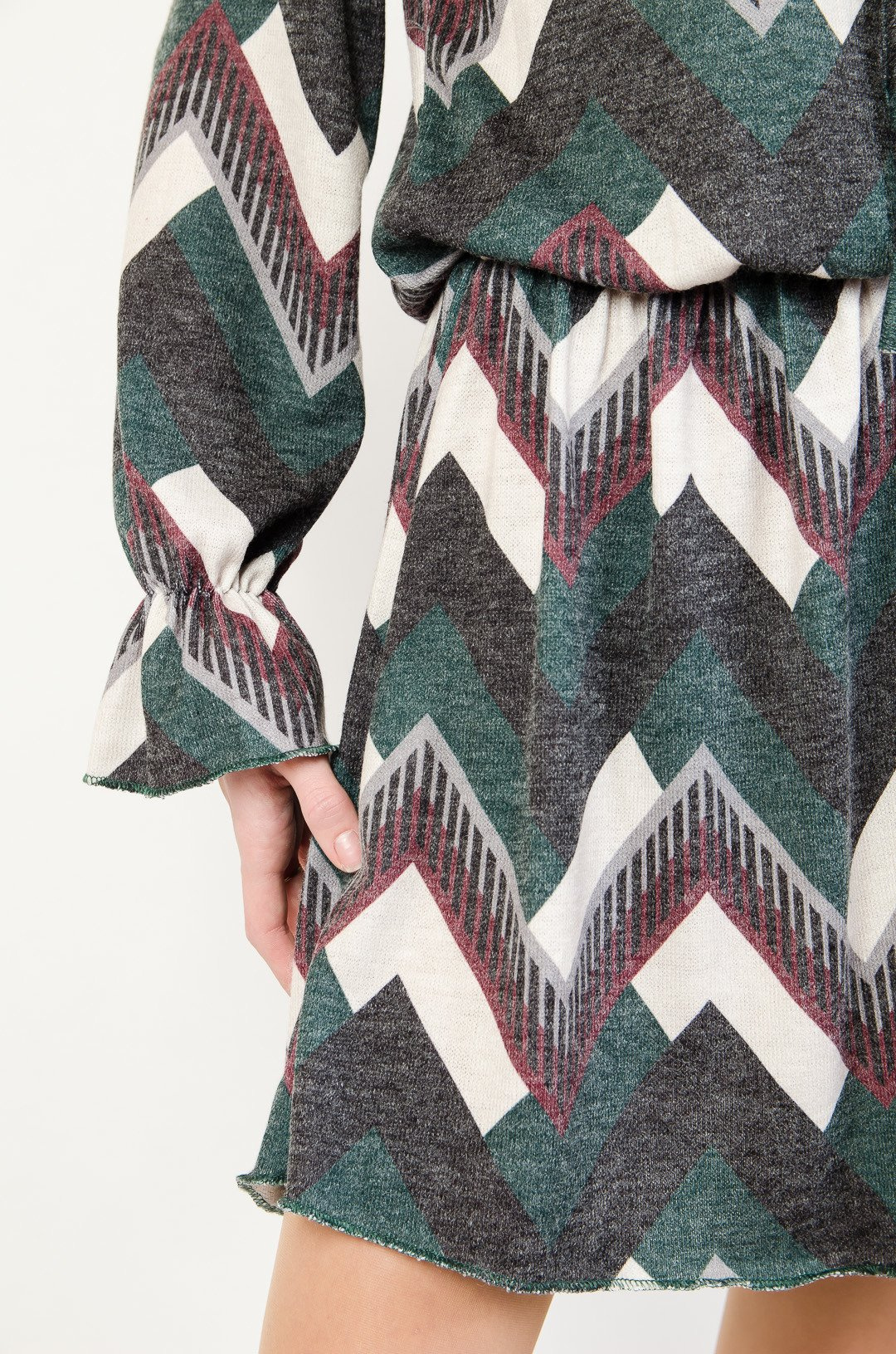 Dzianinowa sukienka w geometryczne wzory.