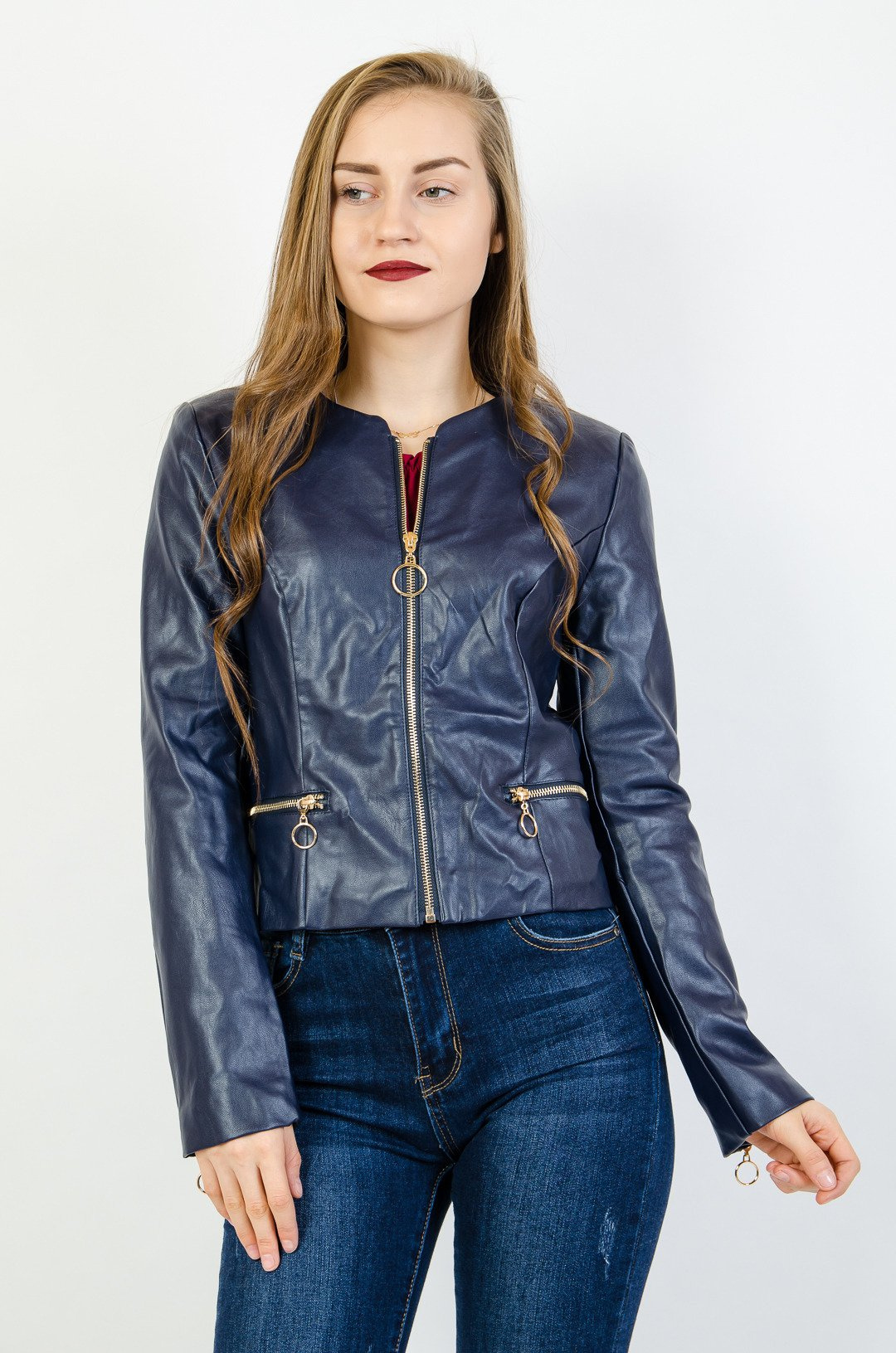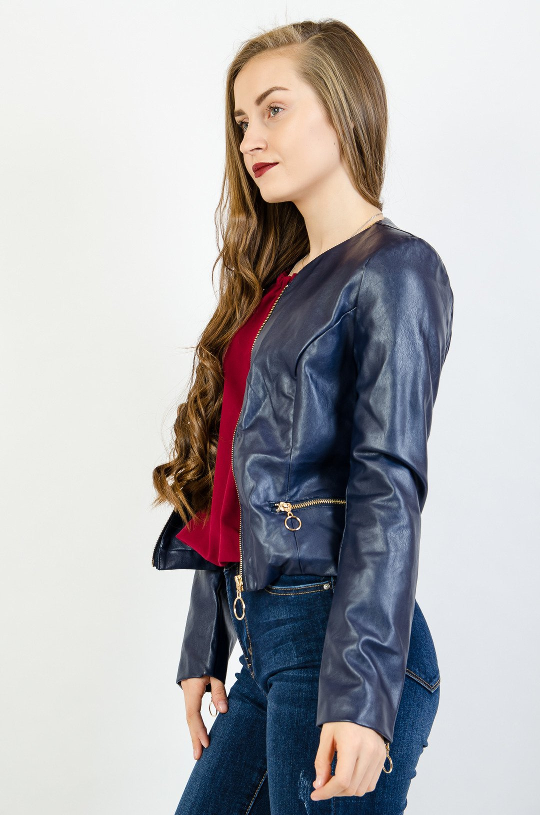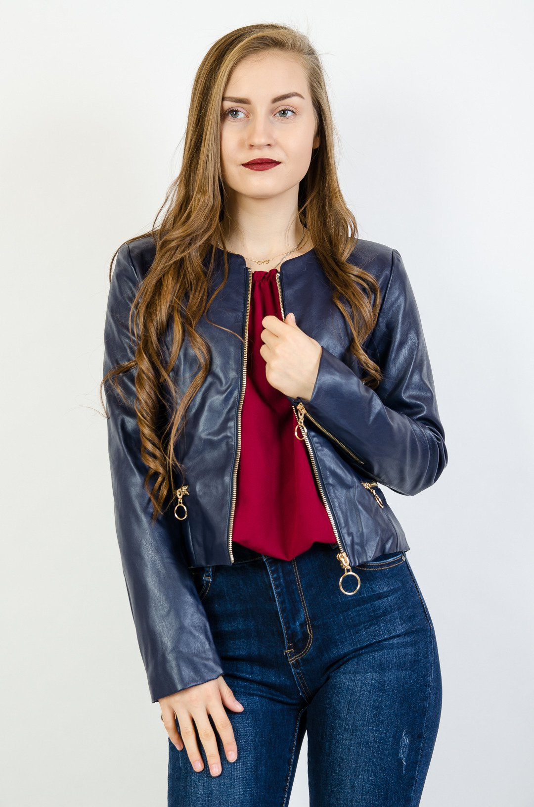 Granatowa ramoneska ze złotymi zamkami, bez kołnierza.