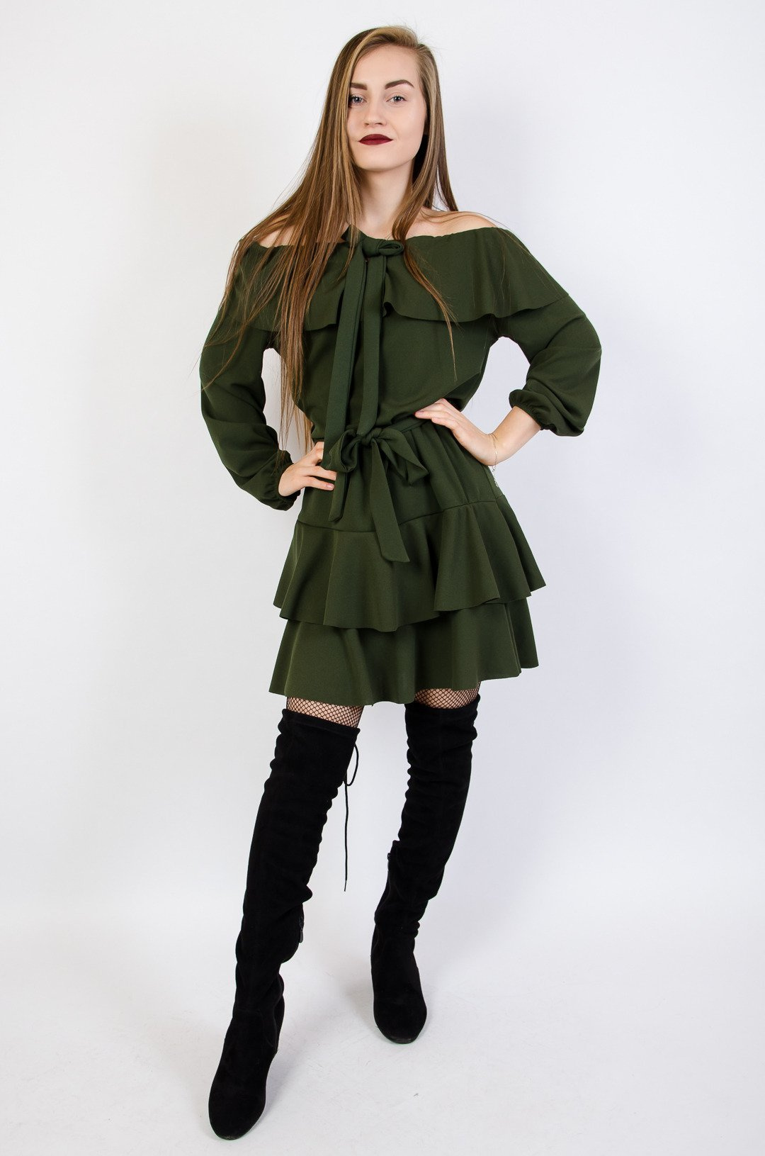 Zielona rozkloszowana sukienka z hiszpańskim dekoltem,