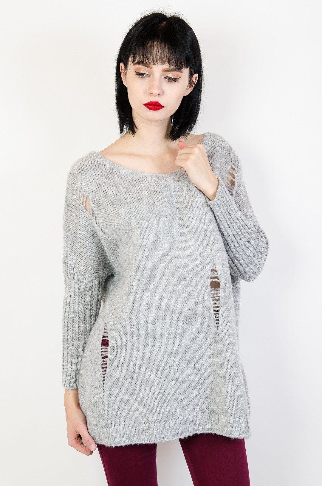 Luźny szary sweter oversize z dziurami