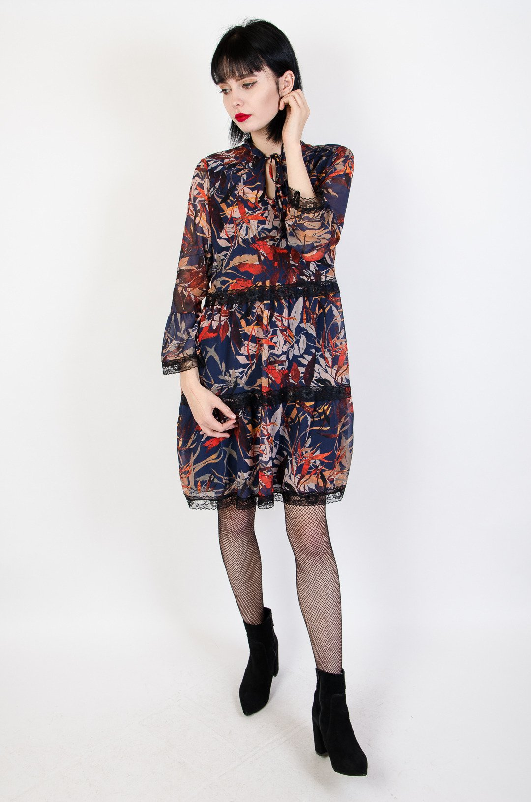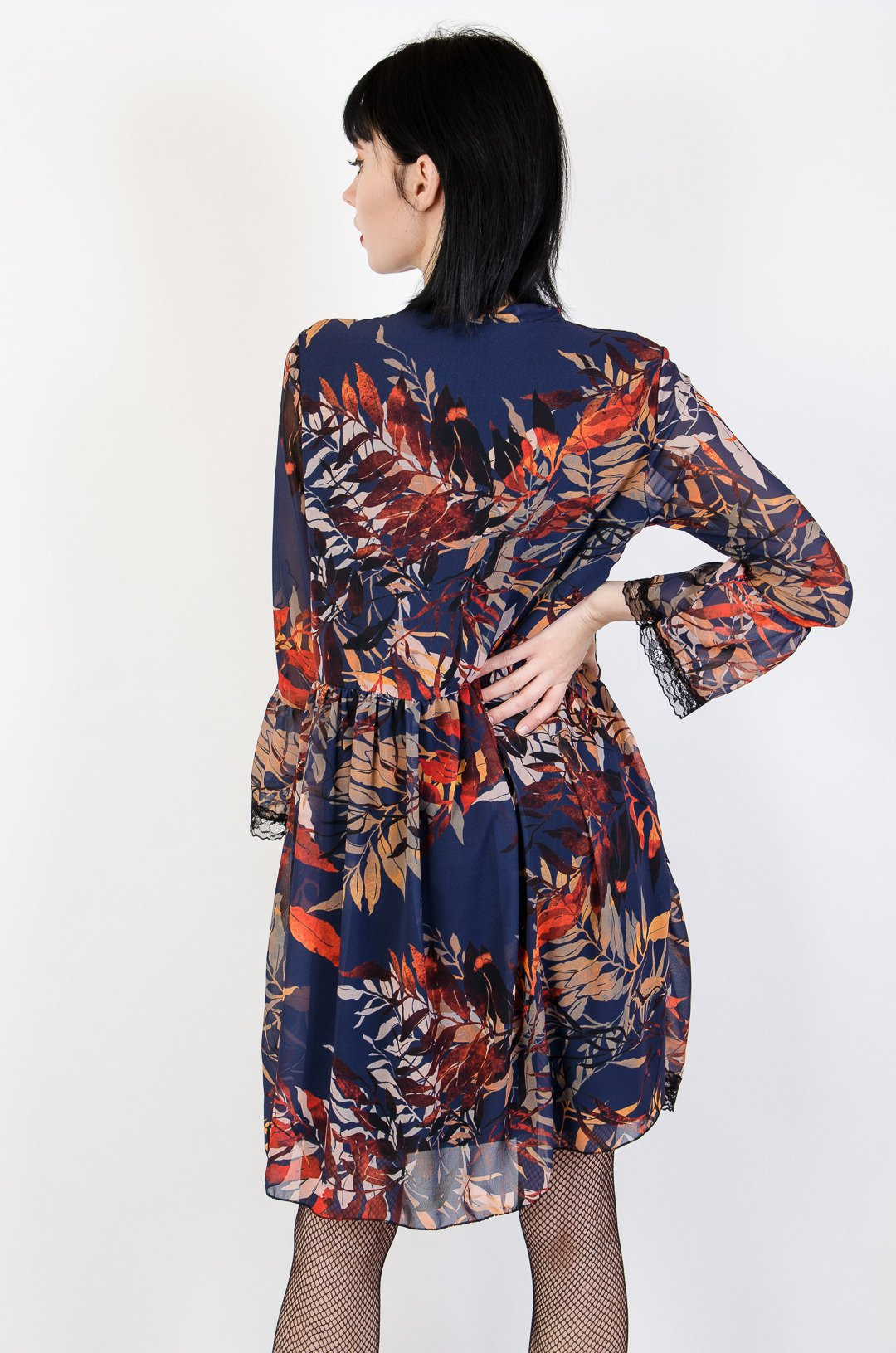 Granatowa sukienka w liście obszyta czarną koronką