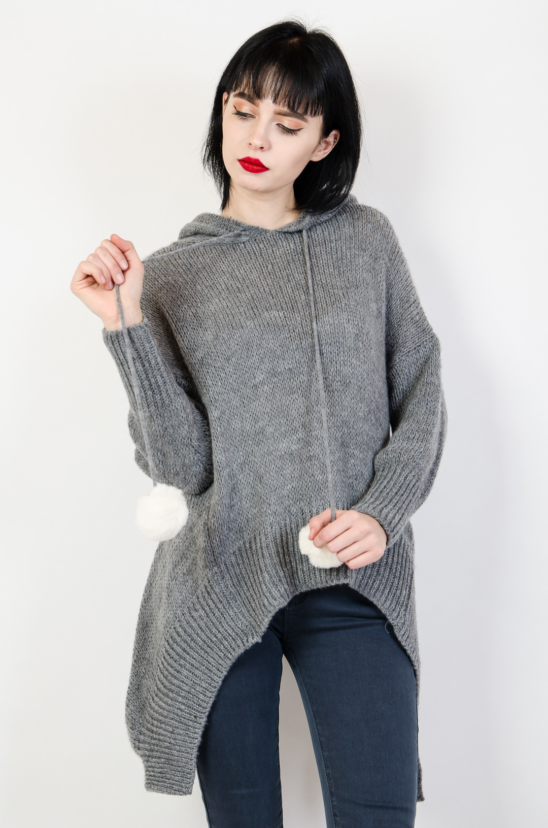 Ciemno szary sweter z dłuższymi bokami oraz kapturem.