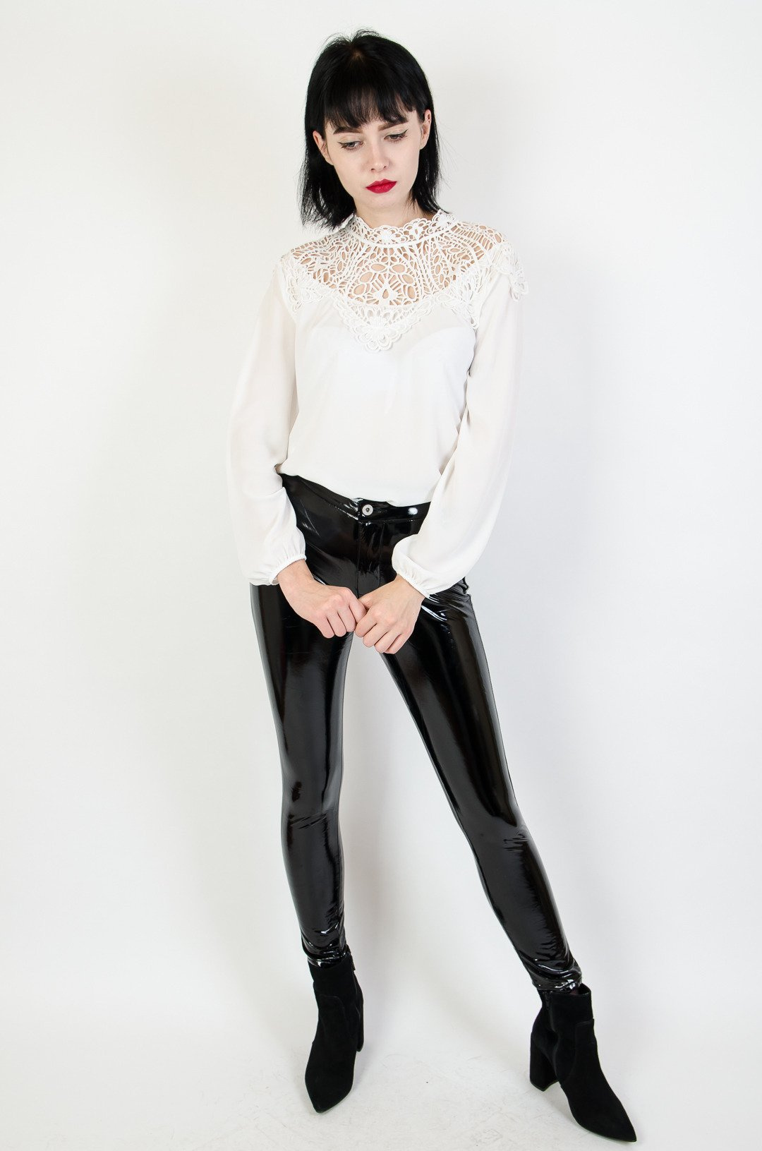 Czarne lakierowane spodnie.