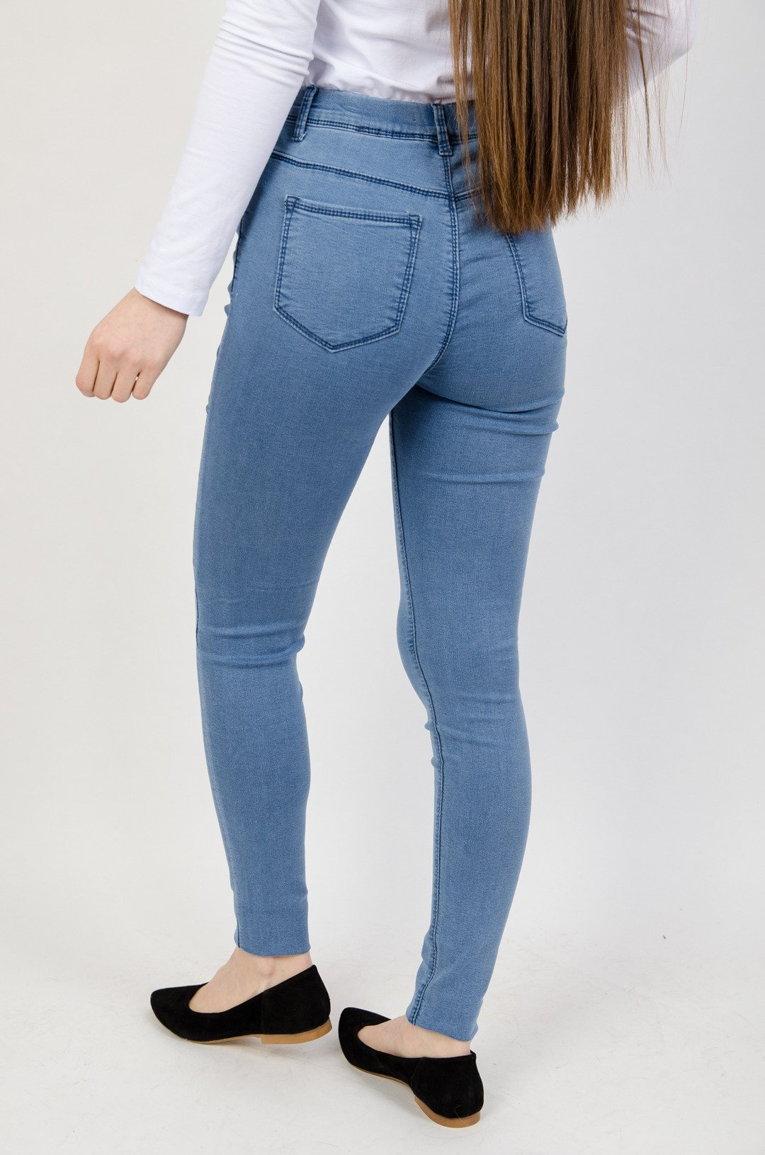 Niebieskie jegginsy z przylegającą nogawką.