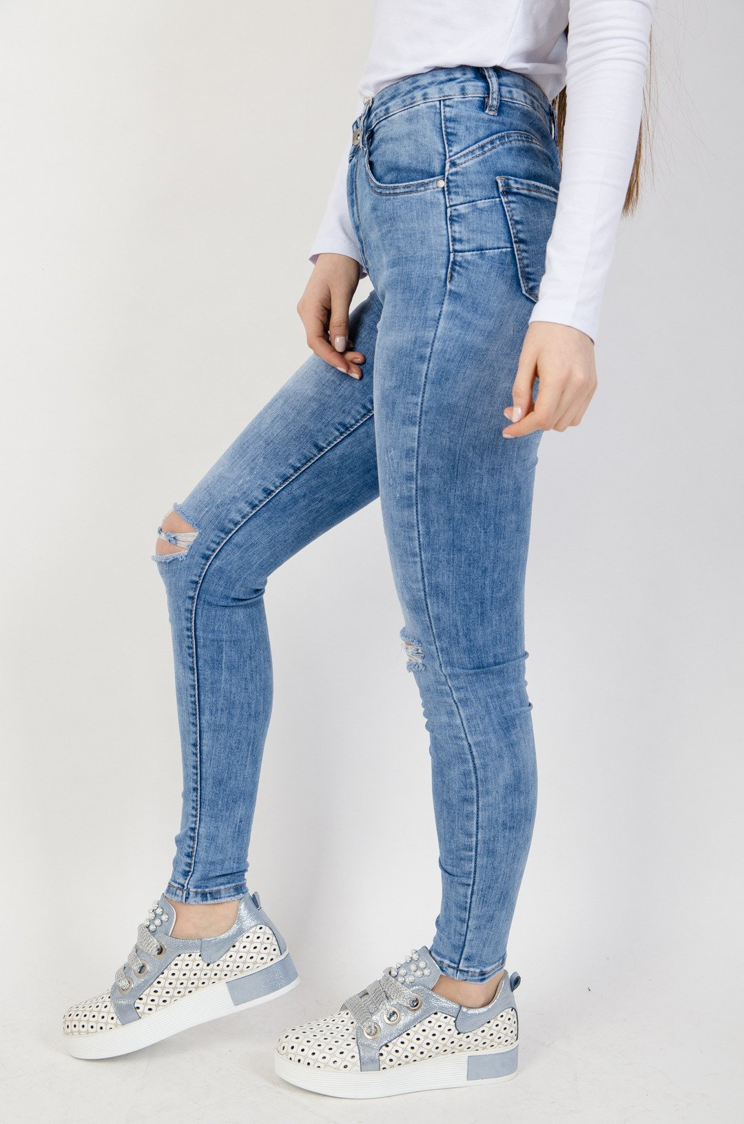 Jasne spodnie jeansowe z rozcięciami na kolanach typu Push-Up.