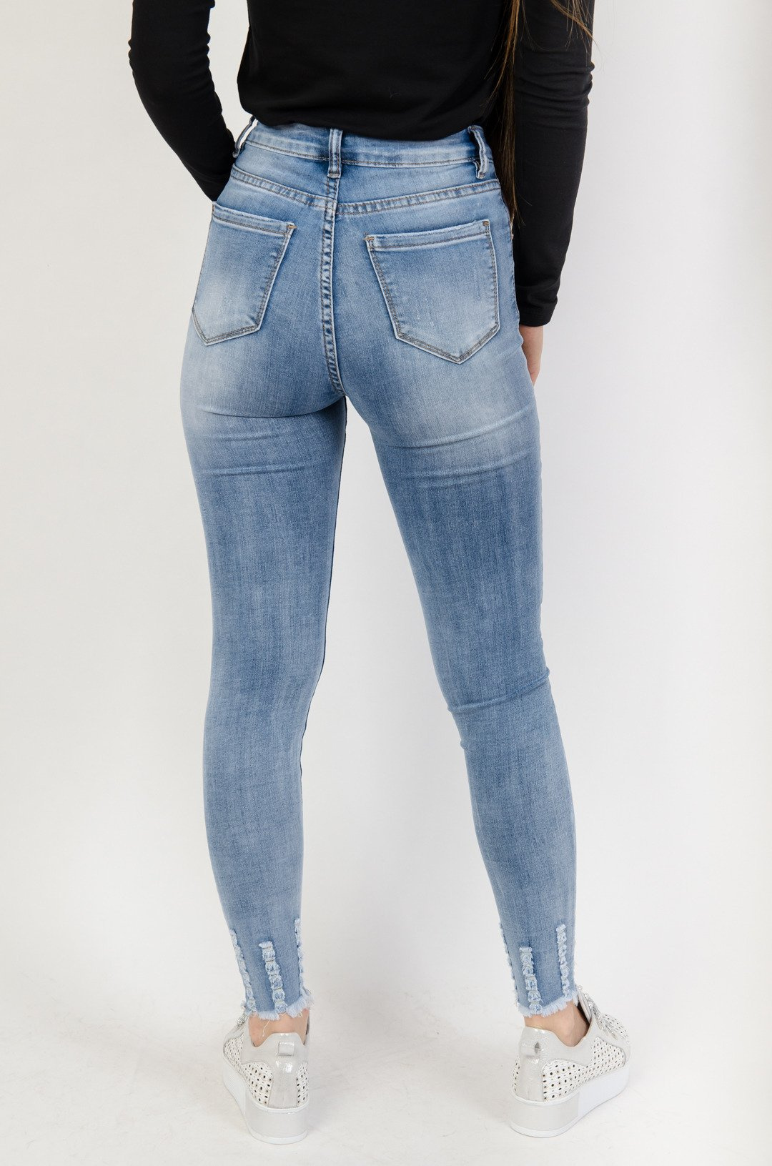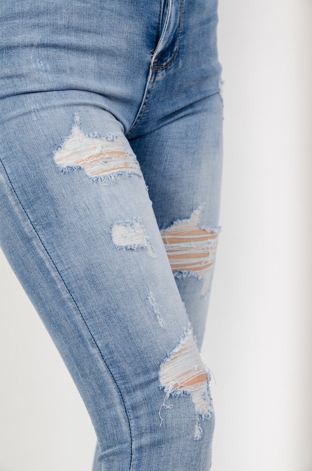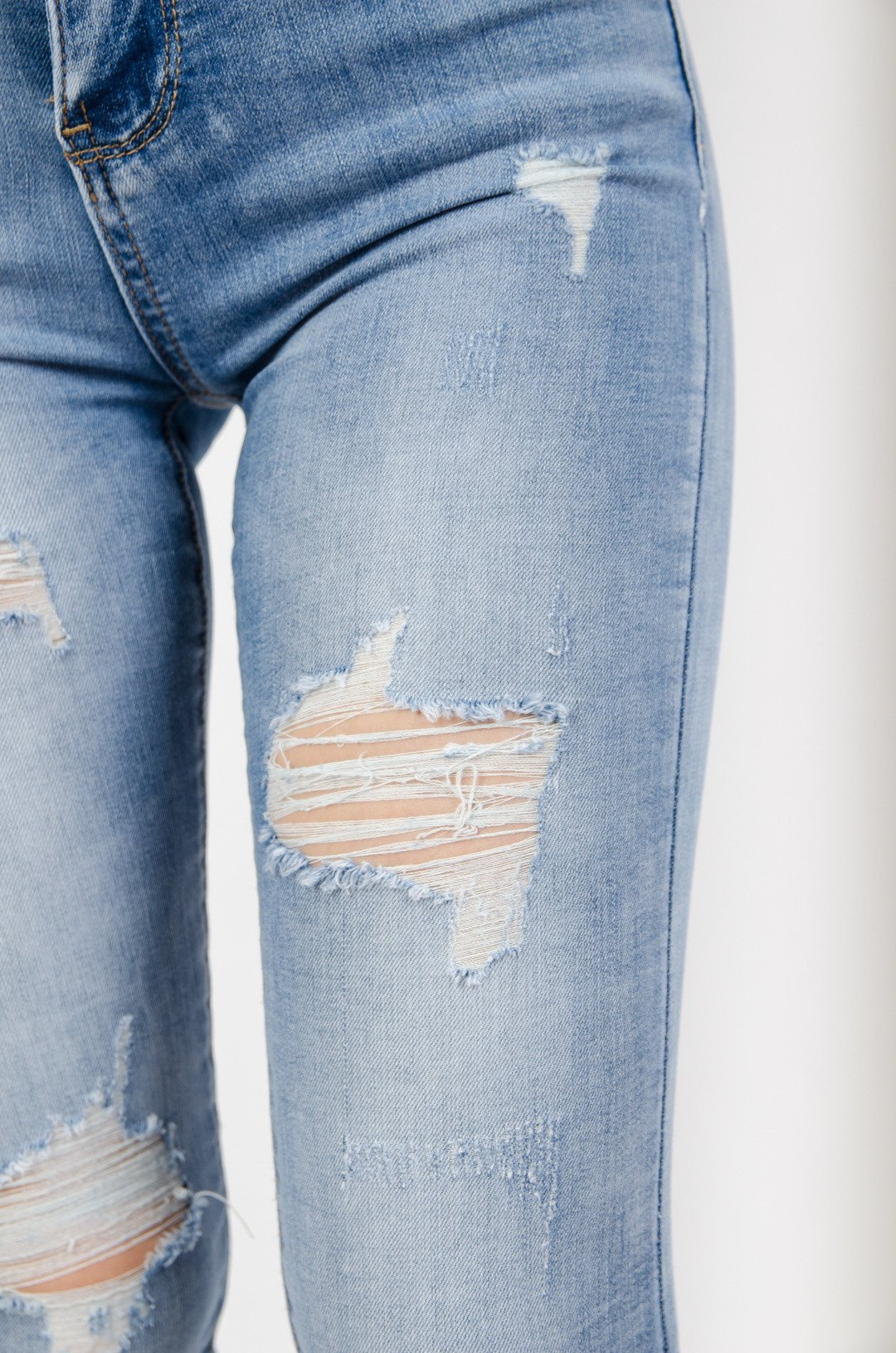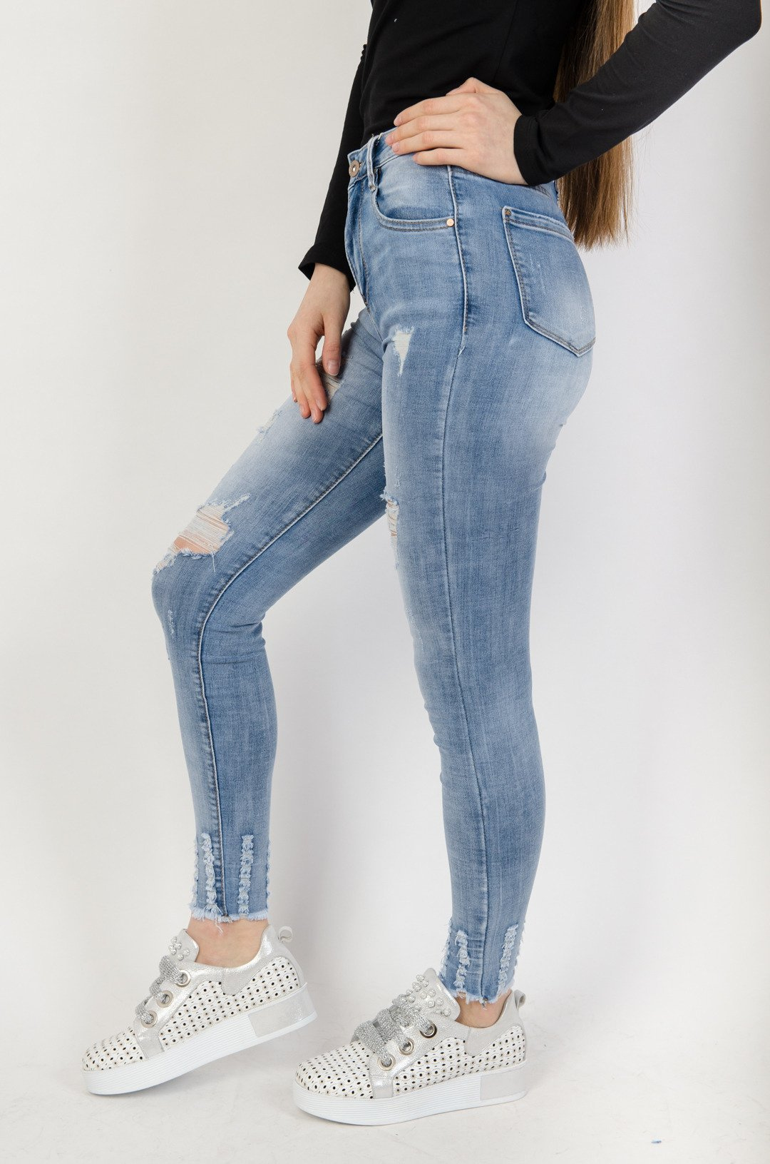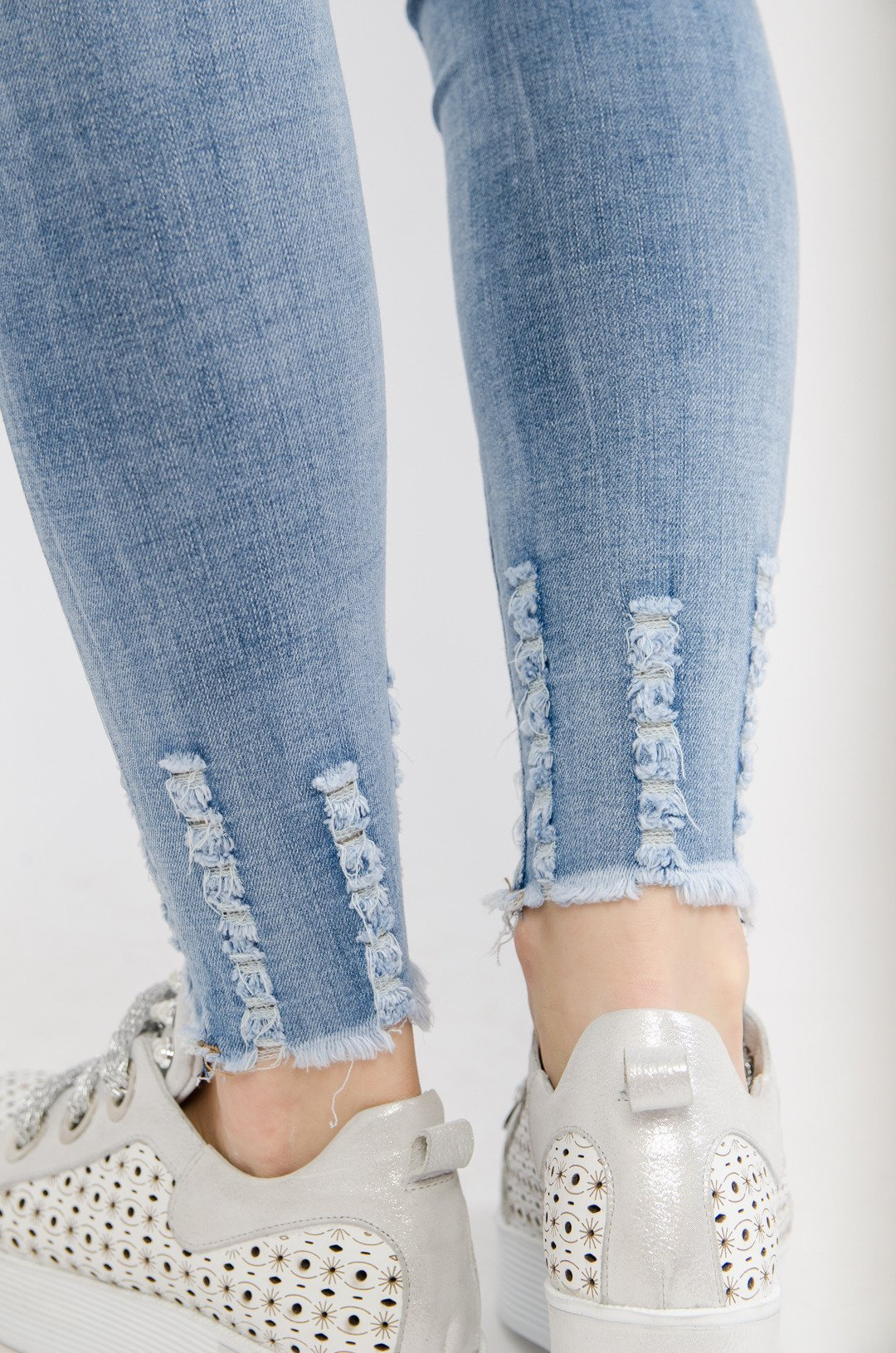 Jasne spodnie jeansowe z przetarciami oraz szarpanymi nogawkami .