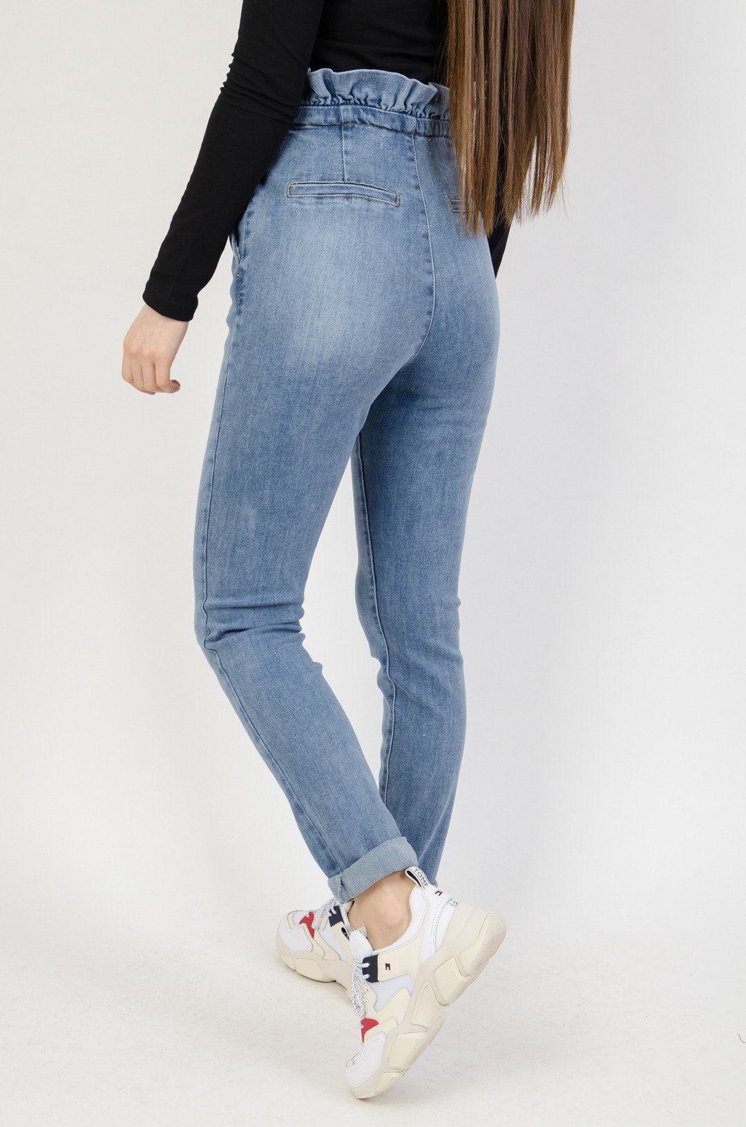 Jasne spodnie jeansowe haremki z falbaną w pasie