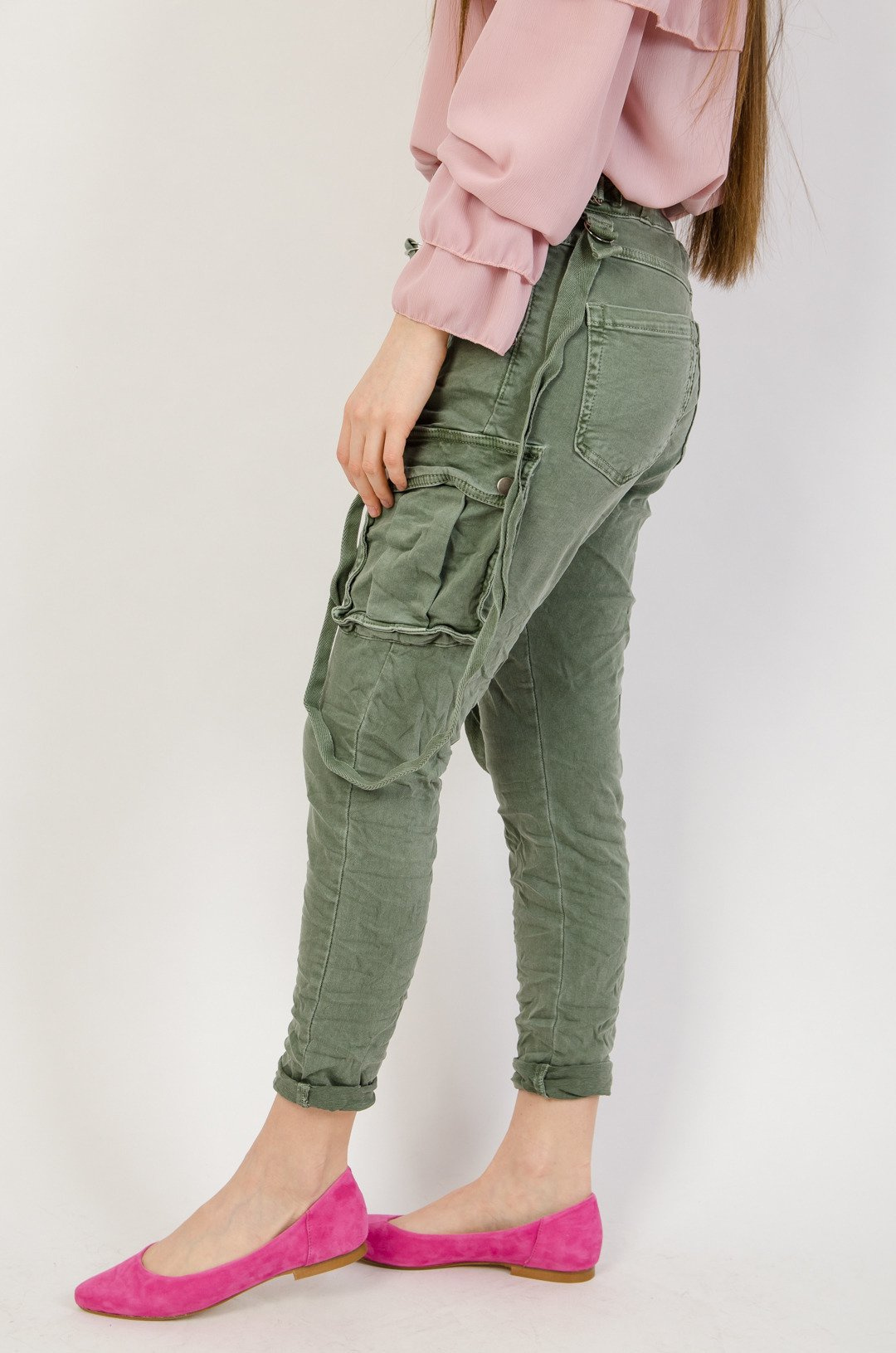 Joggery w kolorze khaki z kieszeniami oraz szelkami.