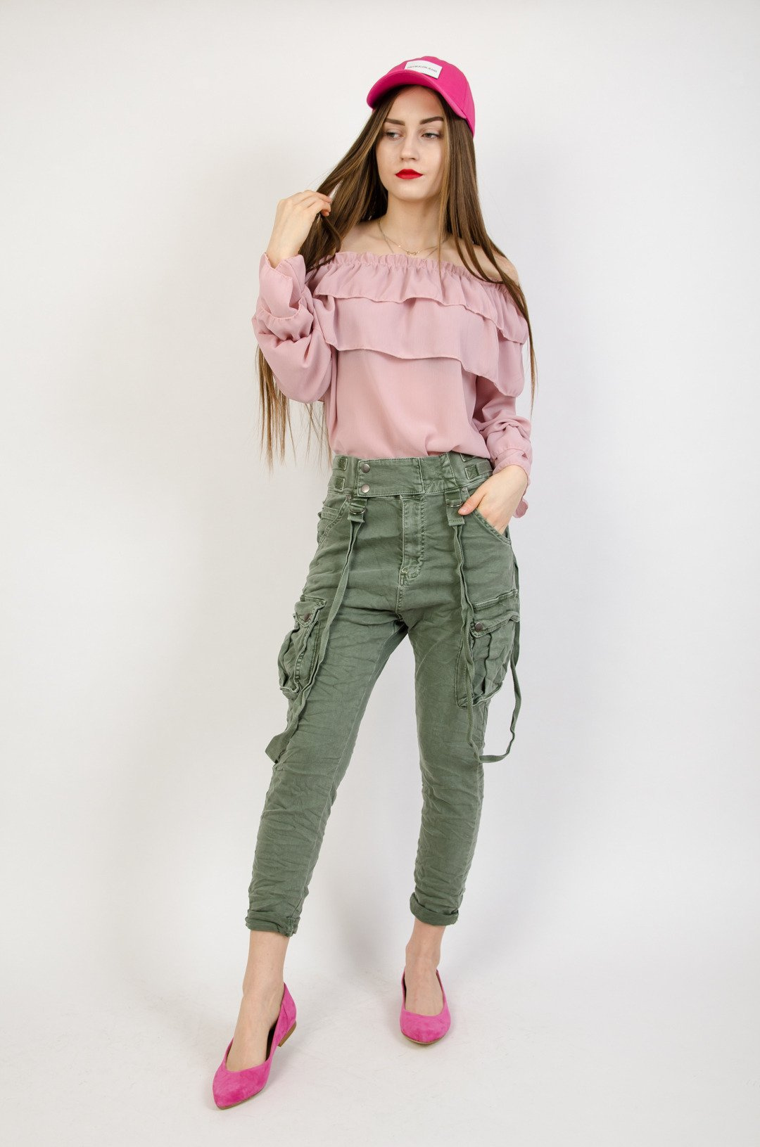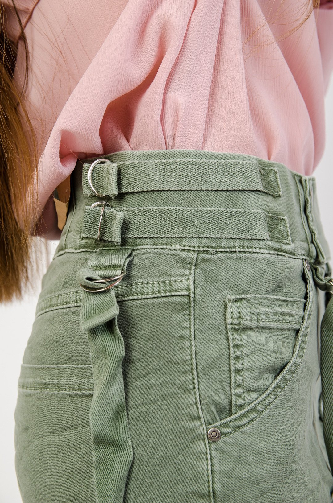 Joggery w kolorze khaki z kieszeniami oraz szelkami