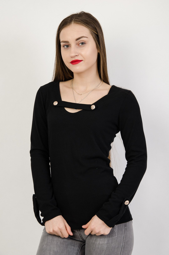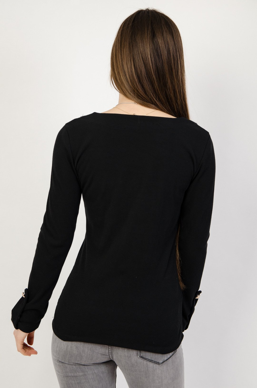 Czarna prążkowana bluzka z guzikami przy dekolcie.