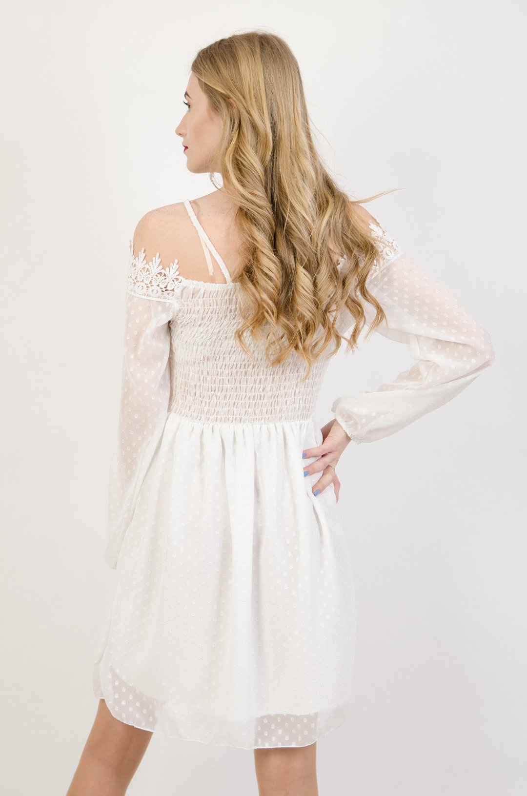 Biała szyfonowa sukienka z odkrytymi ramionami, wyszywana koronką