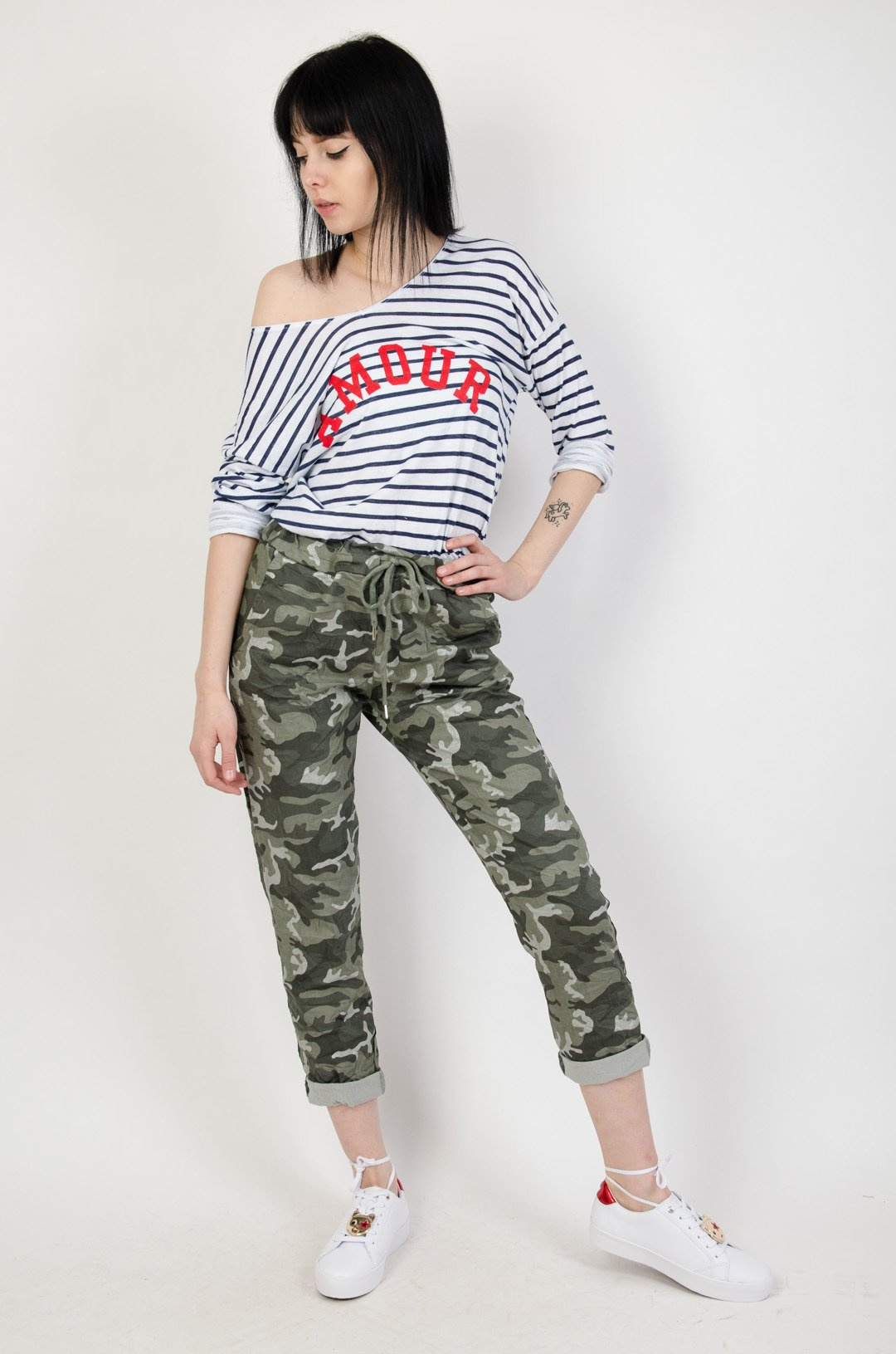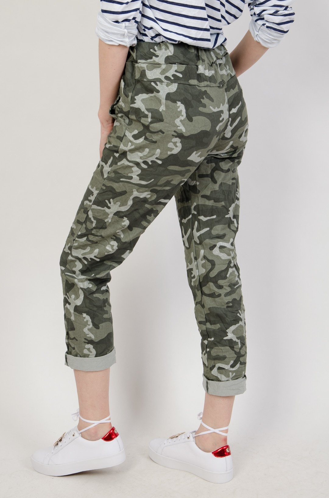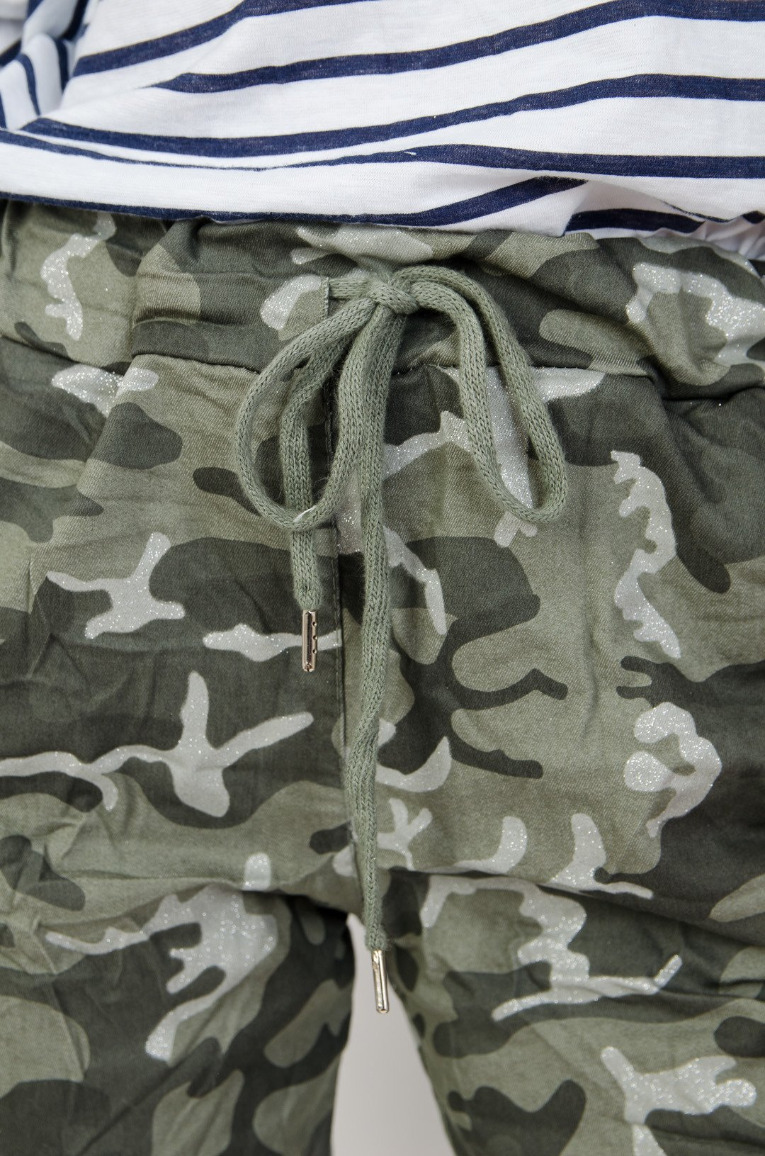 Zielono-srebrne spodnie moro z połyskującymi elementami