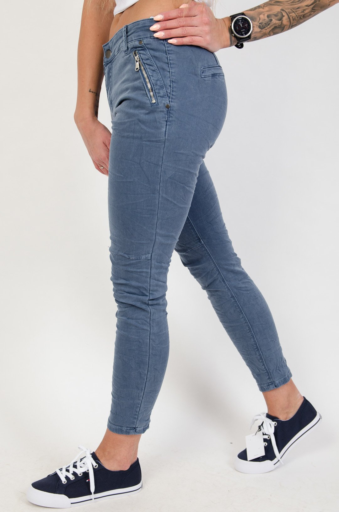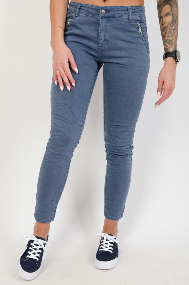 Granatowe spodnie joggery z zamkami przy kieszeniach.