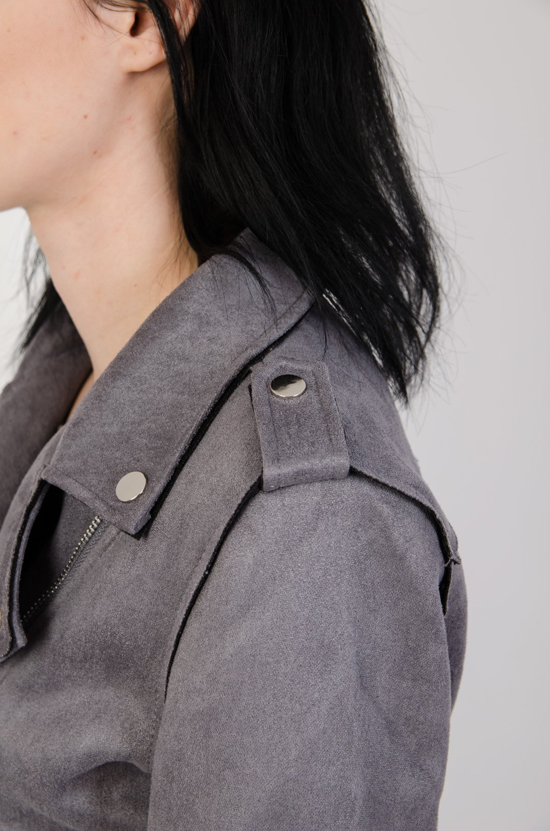 Szara zamszowa kurtka z paskiem na dole oraz srebrnymi zamkami.
