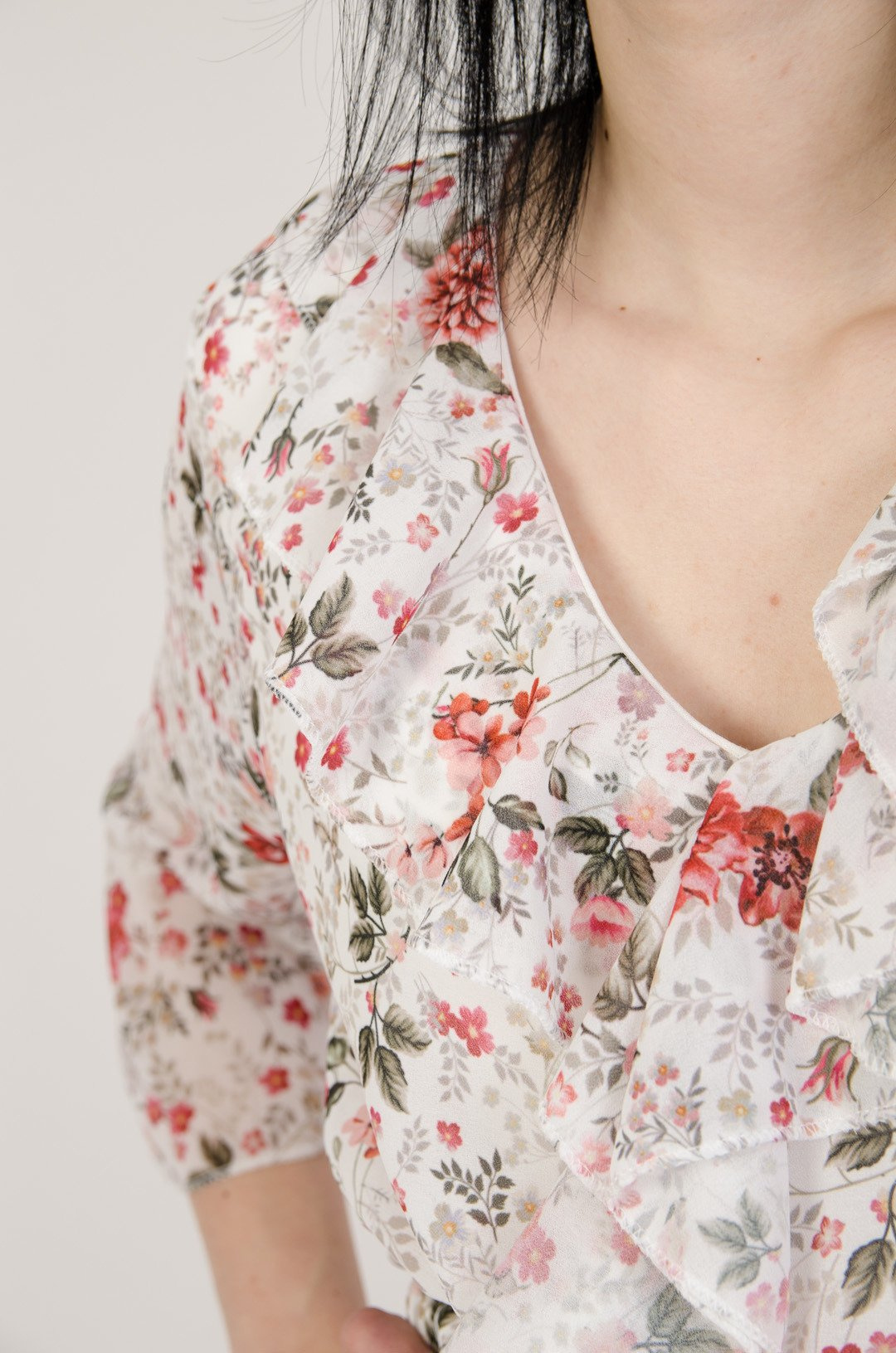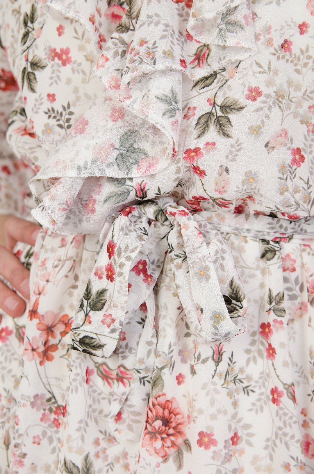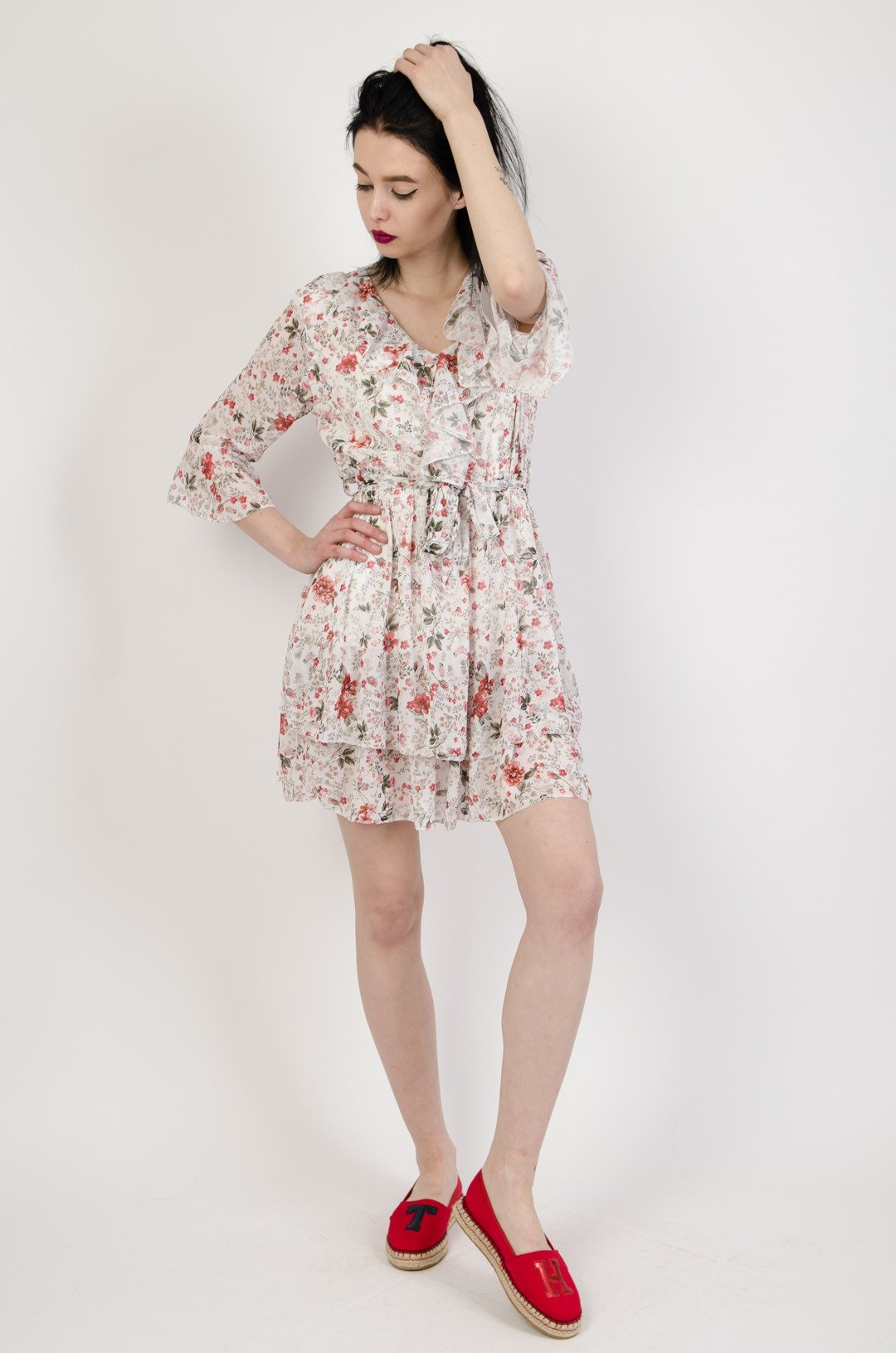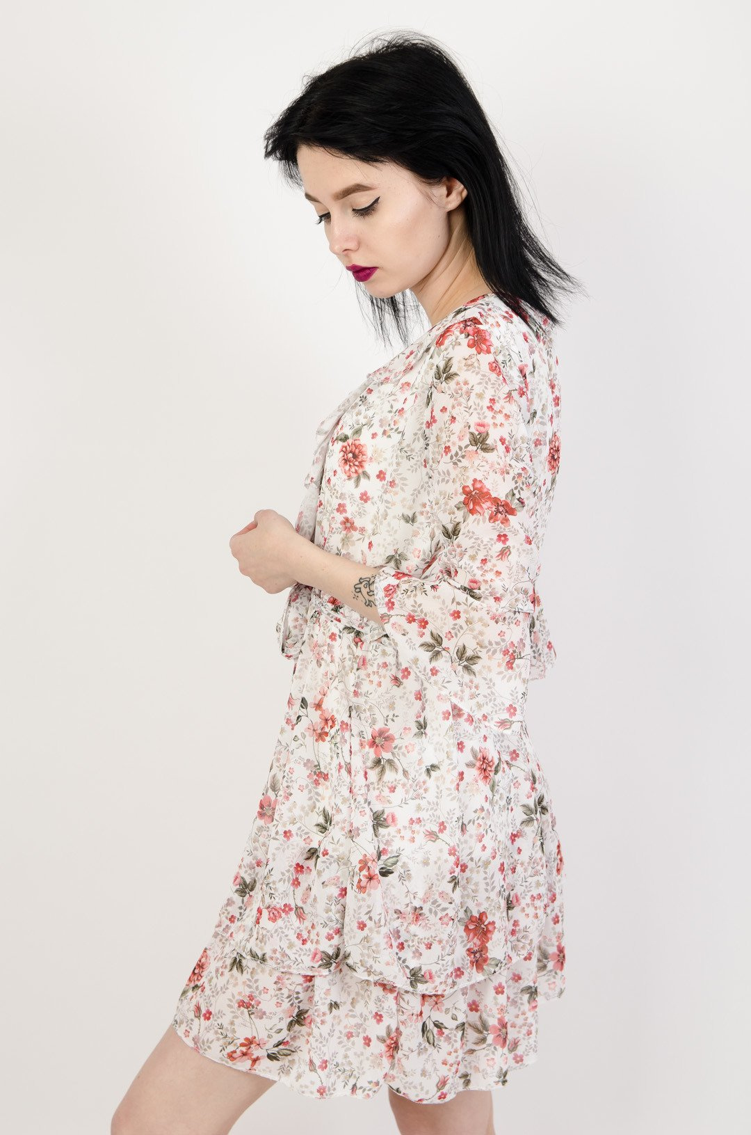 Biała zwiewna sukienka w drobny kwiatowy wzór z falbanami