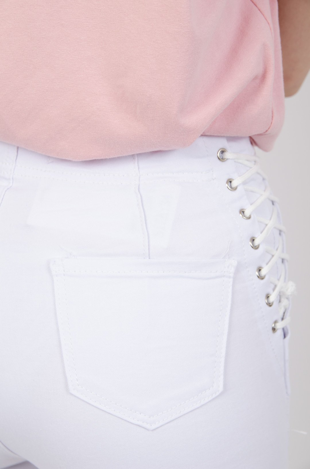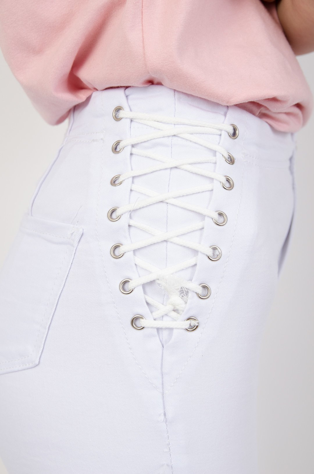 Białe  jeansowe spodnie modelujące z wiązaniem na boku