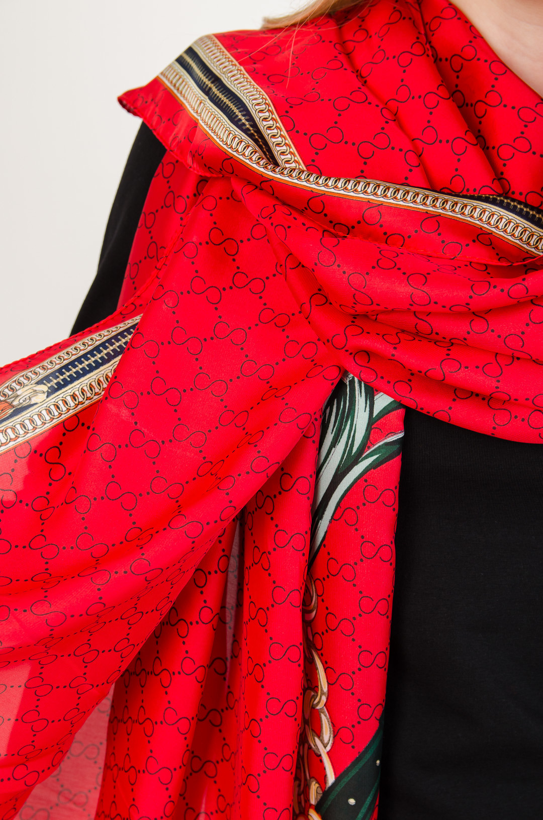 Czerwony satynowy szal we wzory