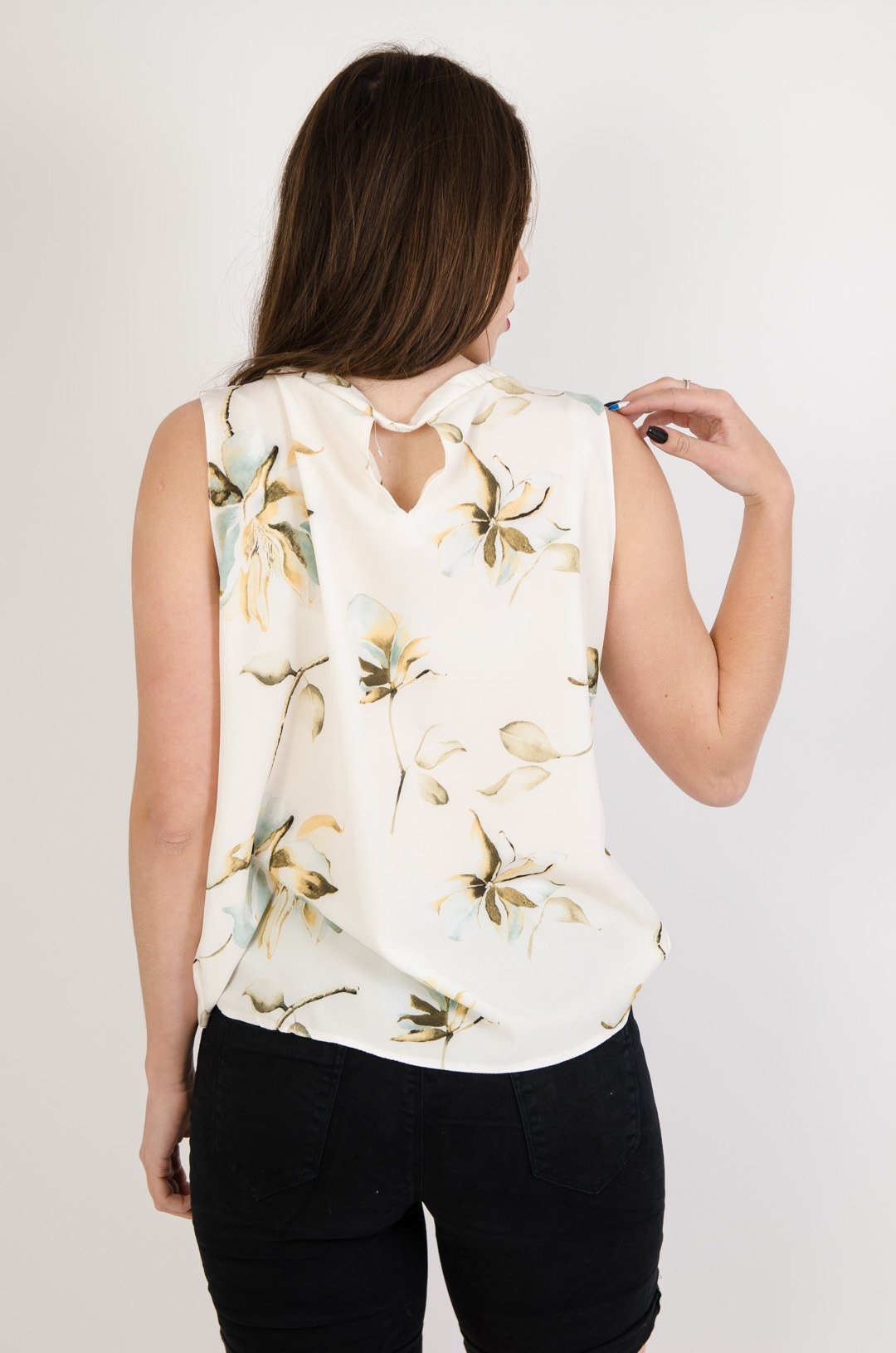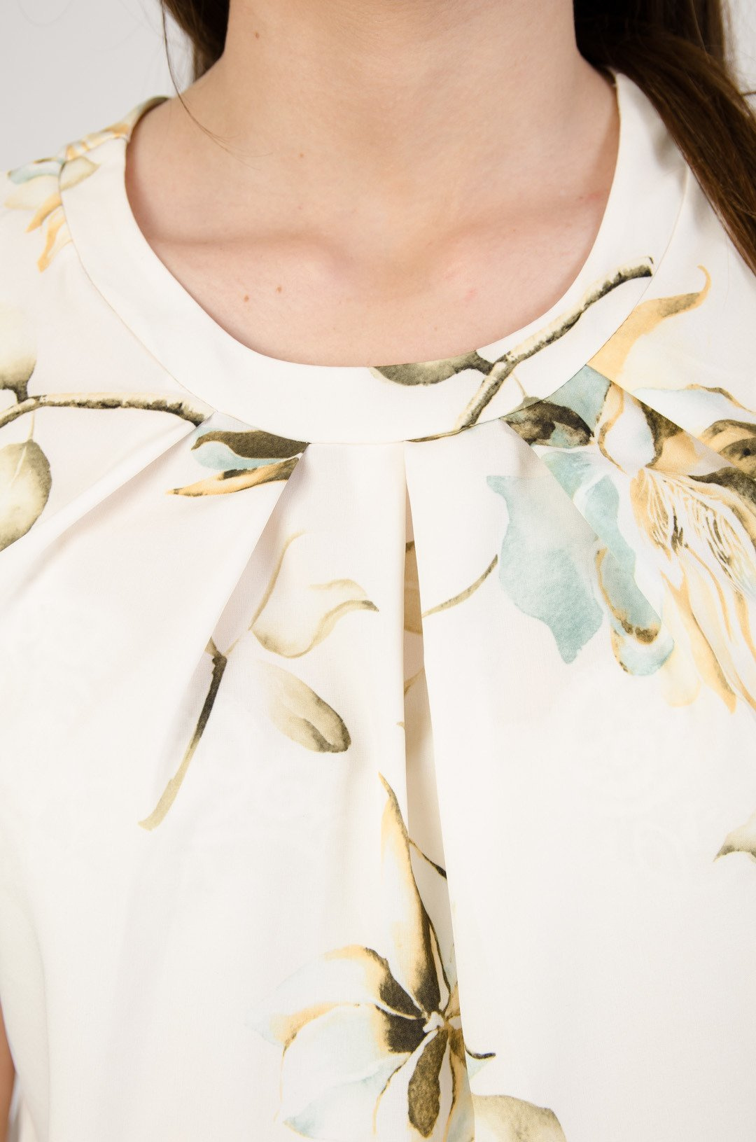 Kremowa bluzka w kwiaty z marszczeniem przy dekolcie