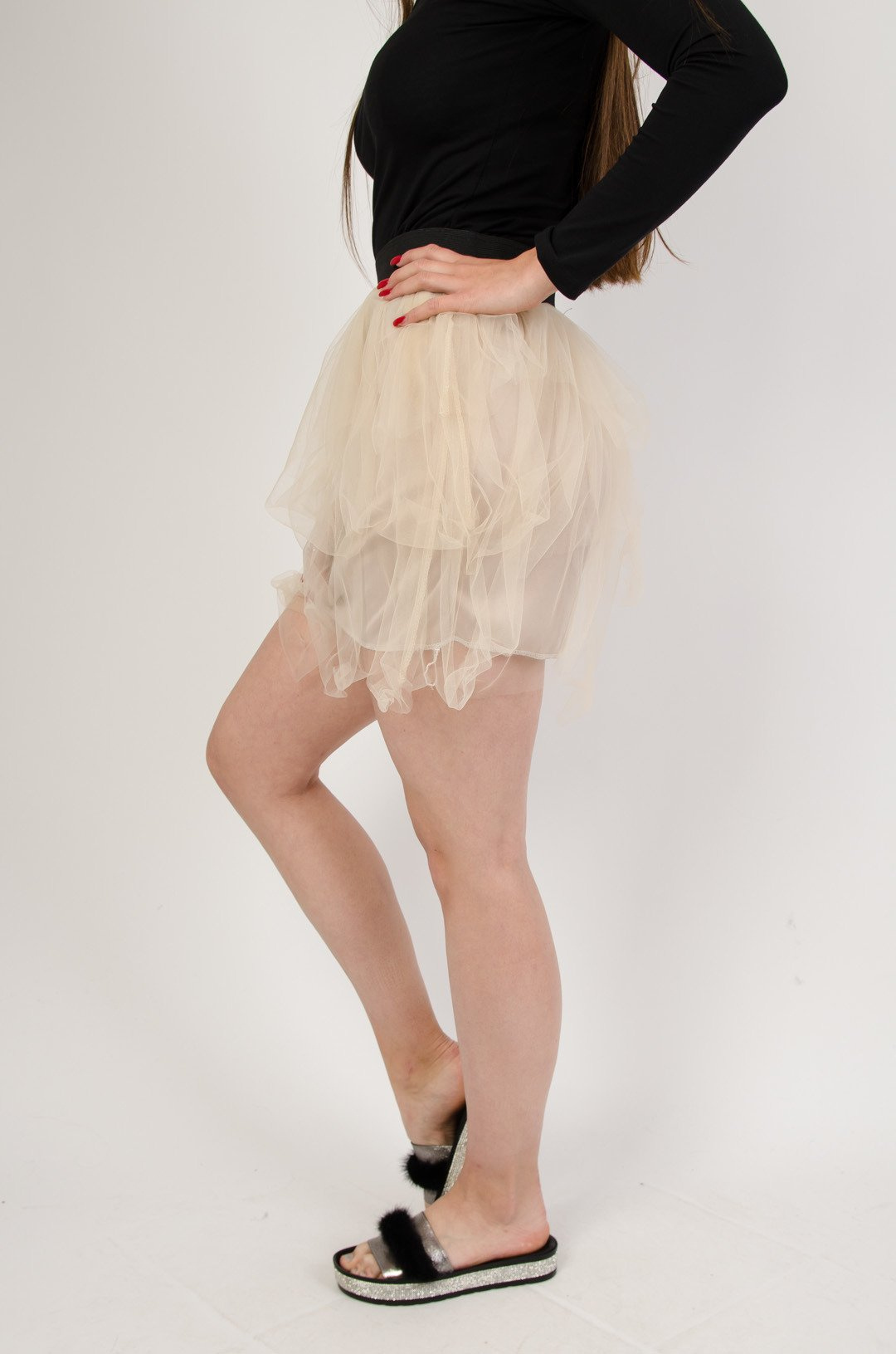 Beżowa tiulowa spódnica z czarną gumą w pasie