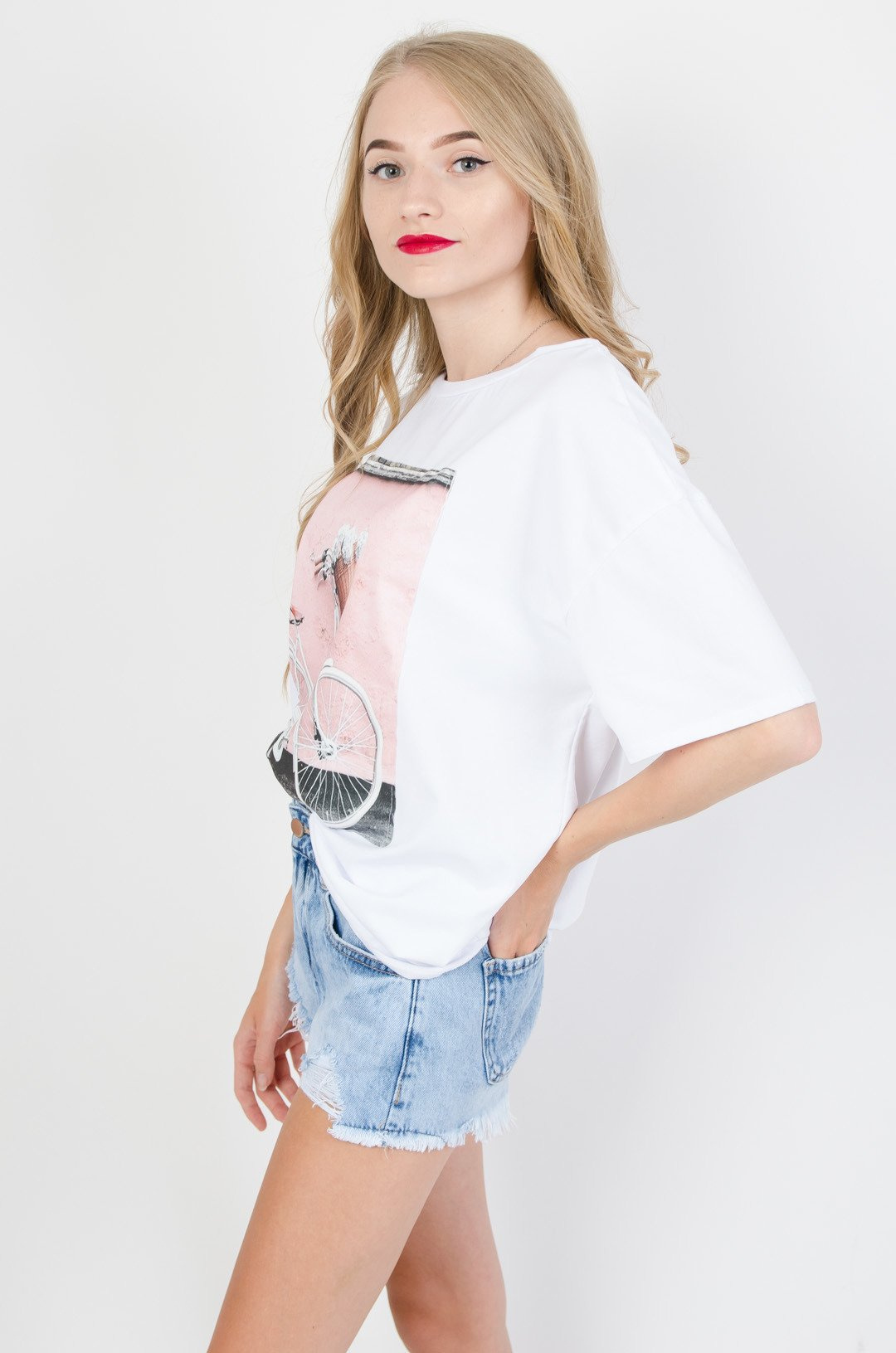 Biała asymetryczna bluzka z naszywką.