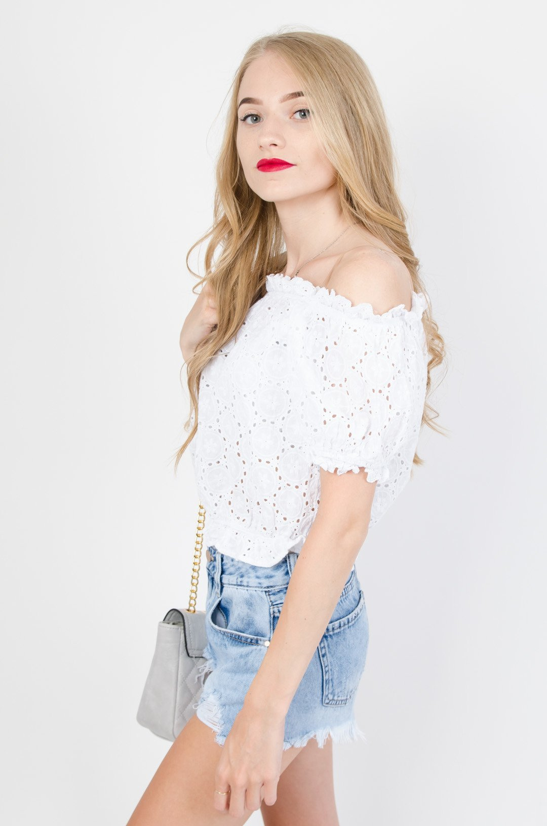 Krótka biała ażurowa bluzka z gumką w talii i rękawach