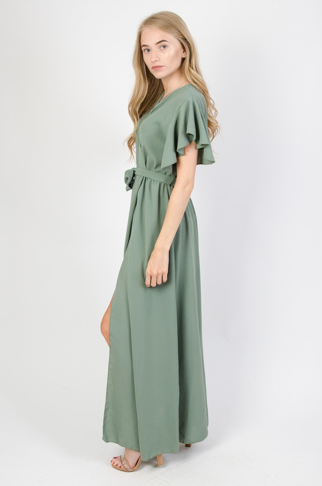 Zielona długa sukienka z rozcięciem wiązana w pasie