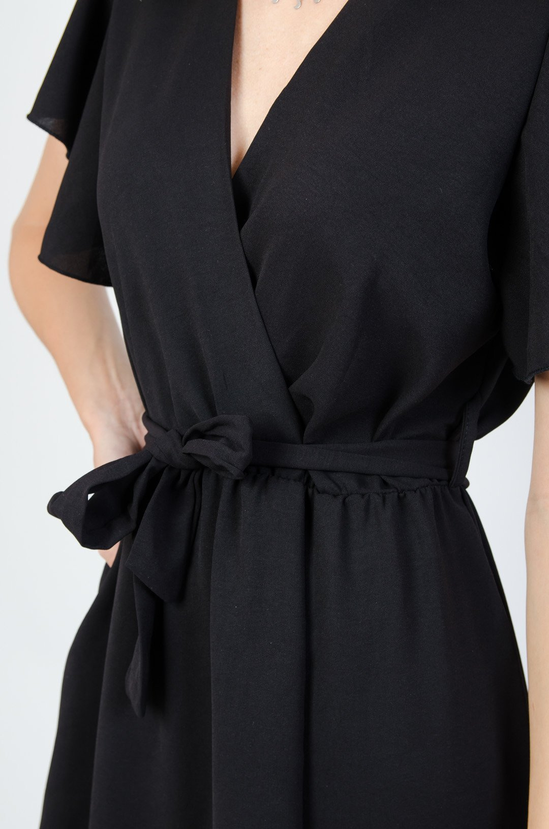 Czarna długa sukienka z rozcięciem wiązana w pasie