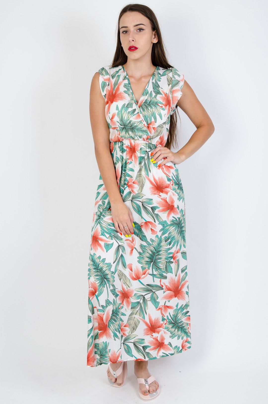 Biała sukienka w kwiaty z kopertowym dekoltem - guma w pasie