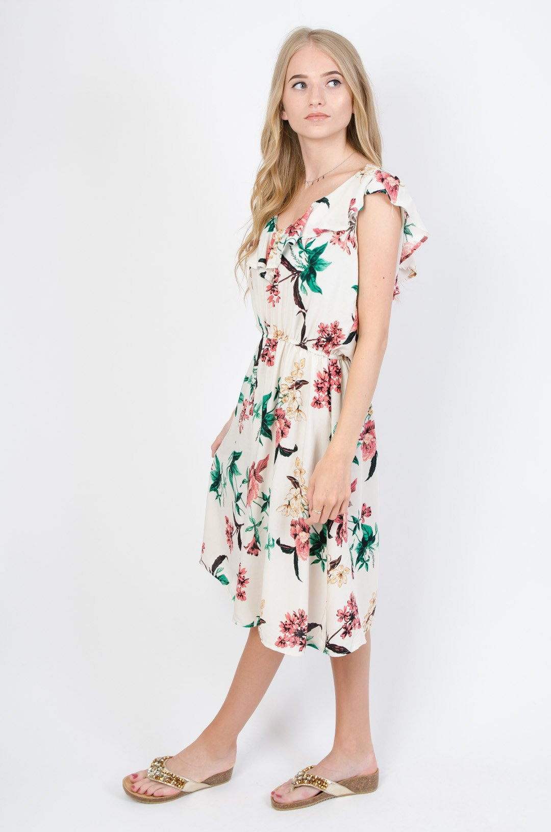 Kremowa sukienka w kwiaty z falbaną w dekolcie